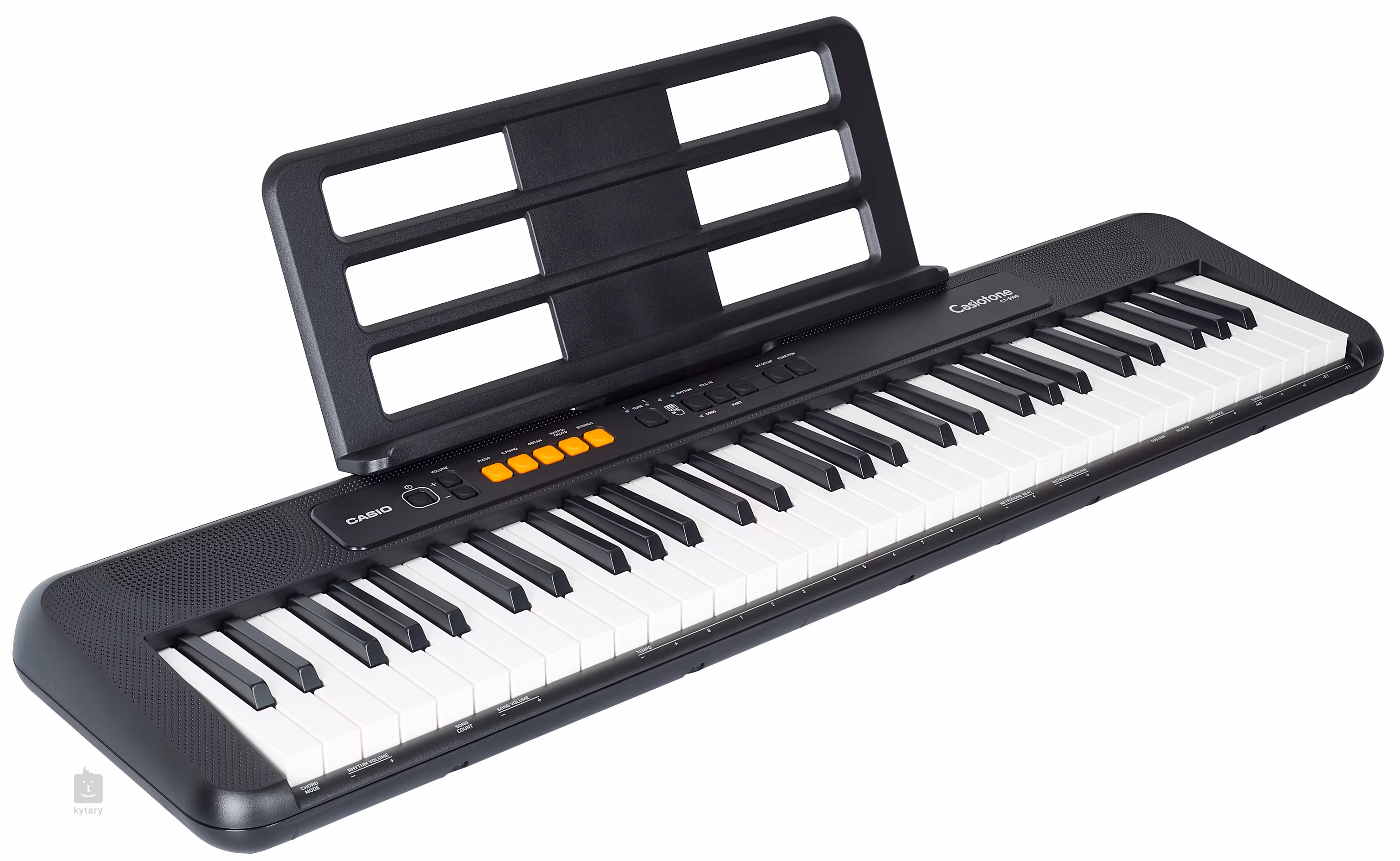 Casio CT-S100 posiada 61 standardowych klawiszy, możesz wzbogacić sygnał dźwiękowy czterema efektami Reverb, 122 rejestrami dźwięku lub użyć automatycznego akompaniamentu, gdzie masz do wyboru 61 rytmów. Klawisze oferują również zintegrowany metronom, przycisk transpozycji/tuningu oraz gniazda odbioru MIDI. O dźwięk dbają dwa głośniki o mocy 2,5W, a jeśli jesteś nocnym graczem, na pewno przyda Ci się wyjście słuchawkowe z tyłu.