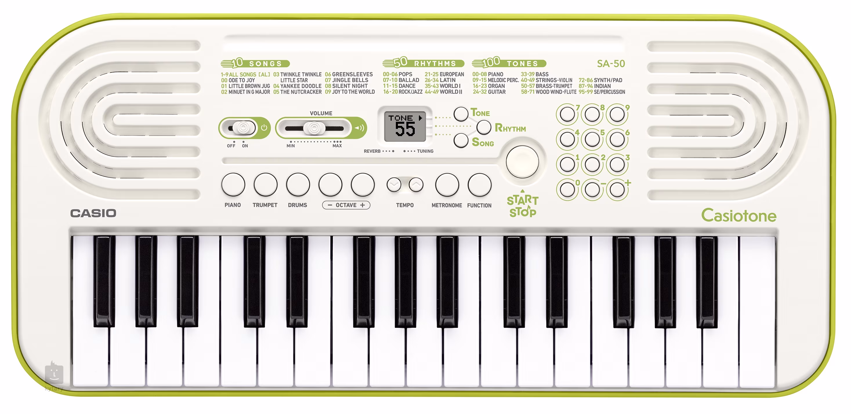 CASIO SA-50 to kompaktowy i niedrogi keyboard przeznaczony przede wszystkim dla początkujących lub dzieci. Mimo swoich rozmiarów posiadają dużą ilość funkcji i dźwięków czy np. metronom. Do przejrzystej kontroli służy podświetlany wyświetlacz LCD. Opcja zasilania bateryjnego jest szczególnie przydatna podczas podróży lub zabawy na świeżym powietrzu. Jako bonus, jest pięćdziesiąt rutyn akompaniujących i dziesięć utworów demo.