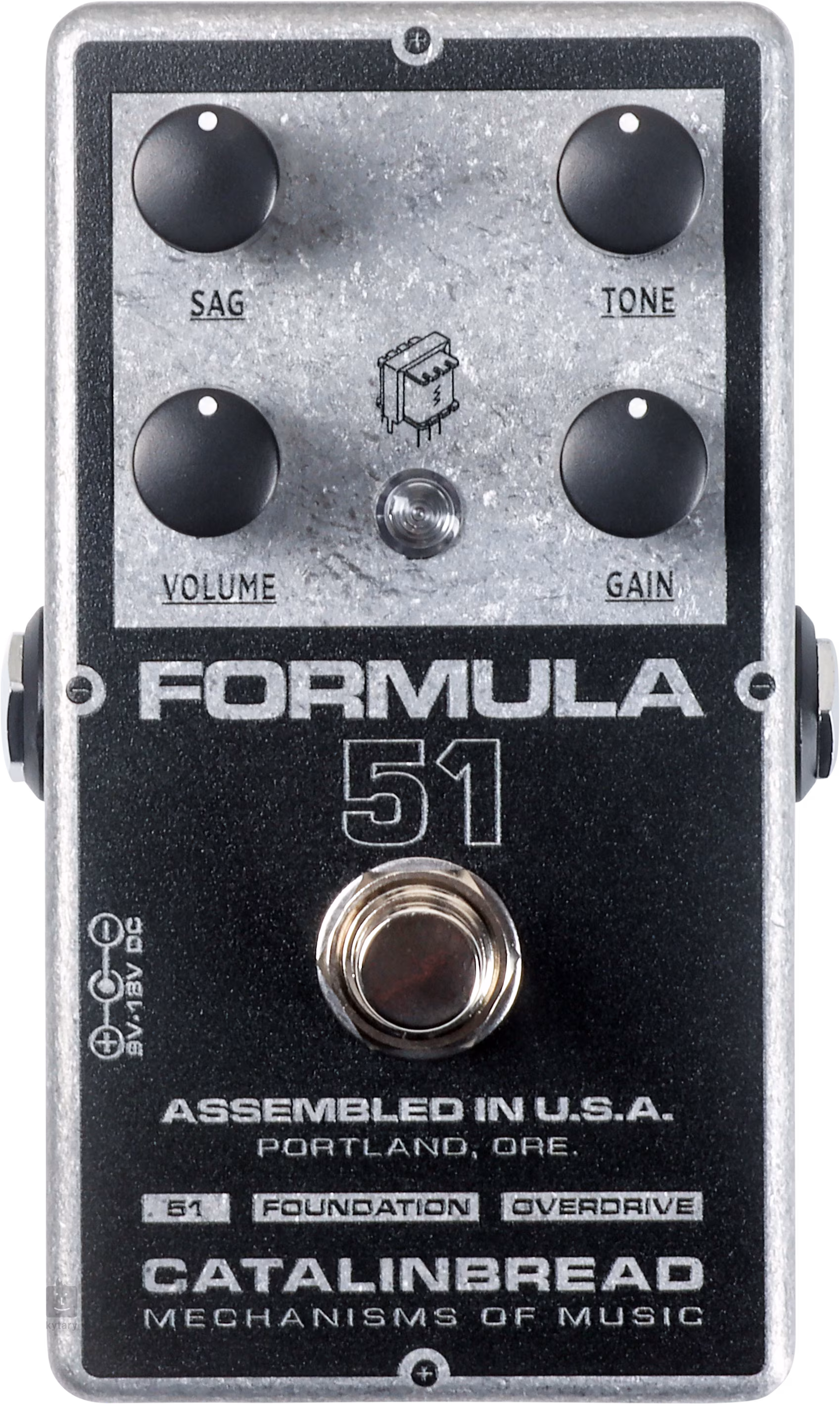 Catalinbread FORMULA 51 to efekt typu overdrive/preamp inspirowany brzmieniem lampowego combo Fender Champ "tweed". Dzięki przedwzmacniaczowi, transformatorowi wyjściowemu i symulowanemu wzmacniaczowi końcowemu oferuje nie tylko iluzję, ale prawdziwą dynamiczną reakcję maszyn lampowych. Trzy tradycyjne pokrętła box określające głośność wyjściową, wzmocnienie i korektor są uzupełnione o kontrolę Sag, której ustawienia bezpośrednio wpływają na sustain, kompresję i klarowność brzmienia. Odwrócony potencjometr Tone pozwala zmienić profil średnich tonów maszyn "Tweed" na charakter brzmienia maszyn "Blackface" i późniejszych "Champ".