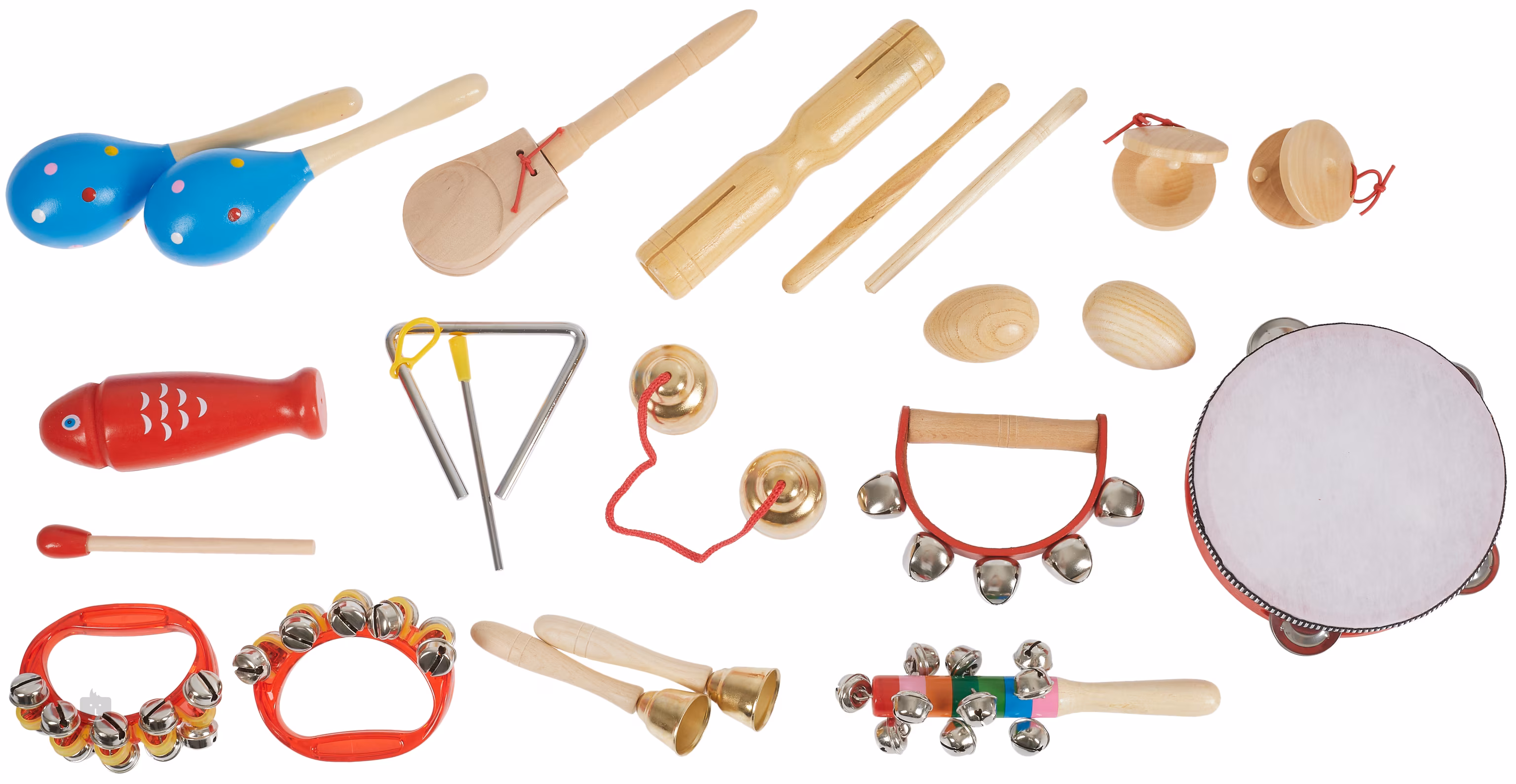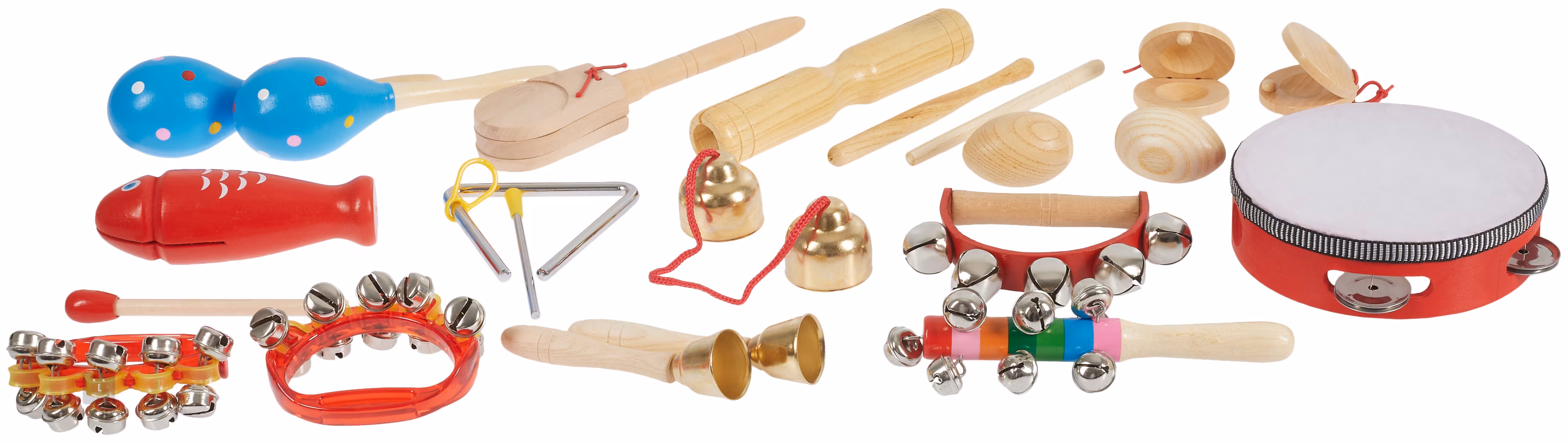 Wszystkie instrumenty w zestawie są wykonane z wysokiej jakości materiałów, które zapewniają trwałość, bezpieczne użytkowanie i przyjemny dźwięk. Zestaw zawiera trójkąt, dwa kastaniety, drewnodźwiękowe z dwoma młoteczkami, dwa bębenki, tamburyn, dwa dzwonki, dzwonki, klaskankę, dwa małe tamburyn, drewno tonowe w kształcie ryby z młoteczkiem, dzwonki na sznurku i średni tamburyn.
