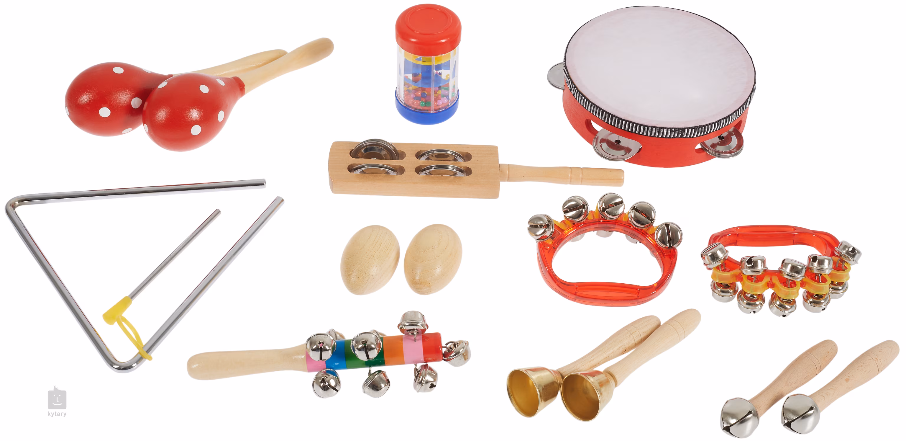 Wszystkie instrumenty w zestawie są wykonane z wysokiej jakości materiałów, które zapewniają trwałość, bezpieczne użytkowanie i przyjemny dźwięk. Zestaw zawiera trójkąt, dwa kastaniety, cztery pałeczki dźwiękowe o różnych kształtach z pięcioma młoteczkami, dwa bębenki, tamburyn, dwa dzwonki, trzy klaskanki, dwa małe tamburyny, parę drewienek tonowych, shaker, przegrzebek i średni tamburyn.