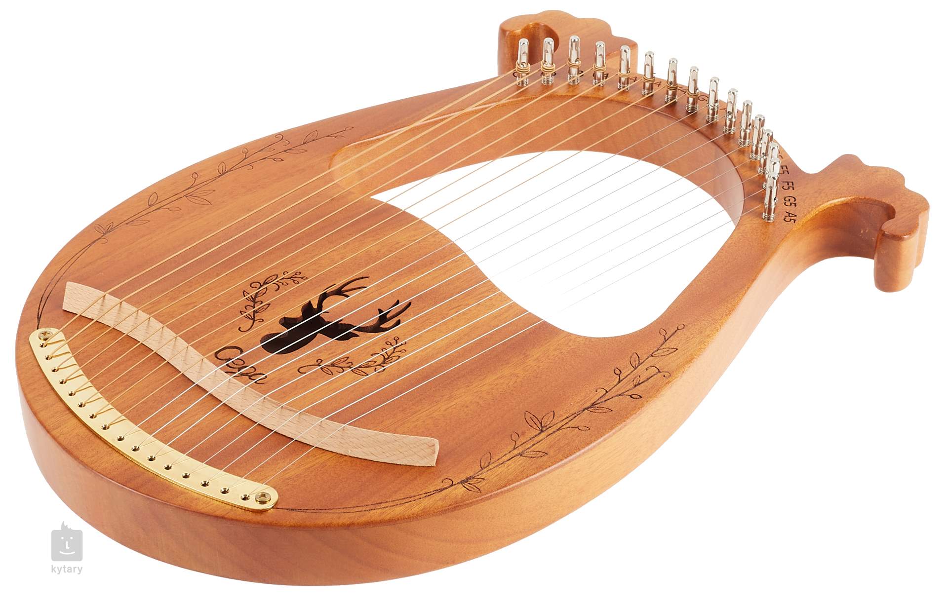 Lyra LH16W-T jest w naturalnym kolorze drewna, posiada szesnaście strun i jest ozdobiona rzeźbieniem wokół otworu dźwiękowego w kształcie jelenia.