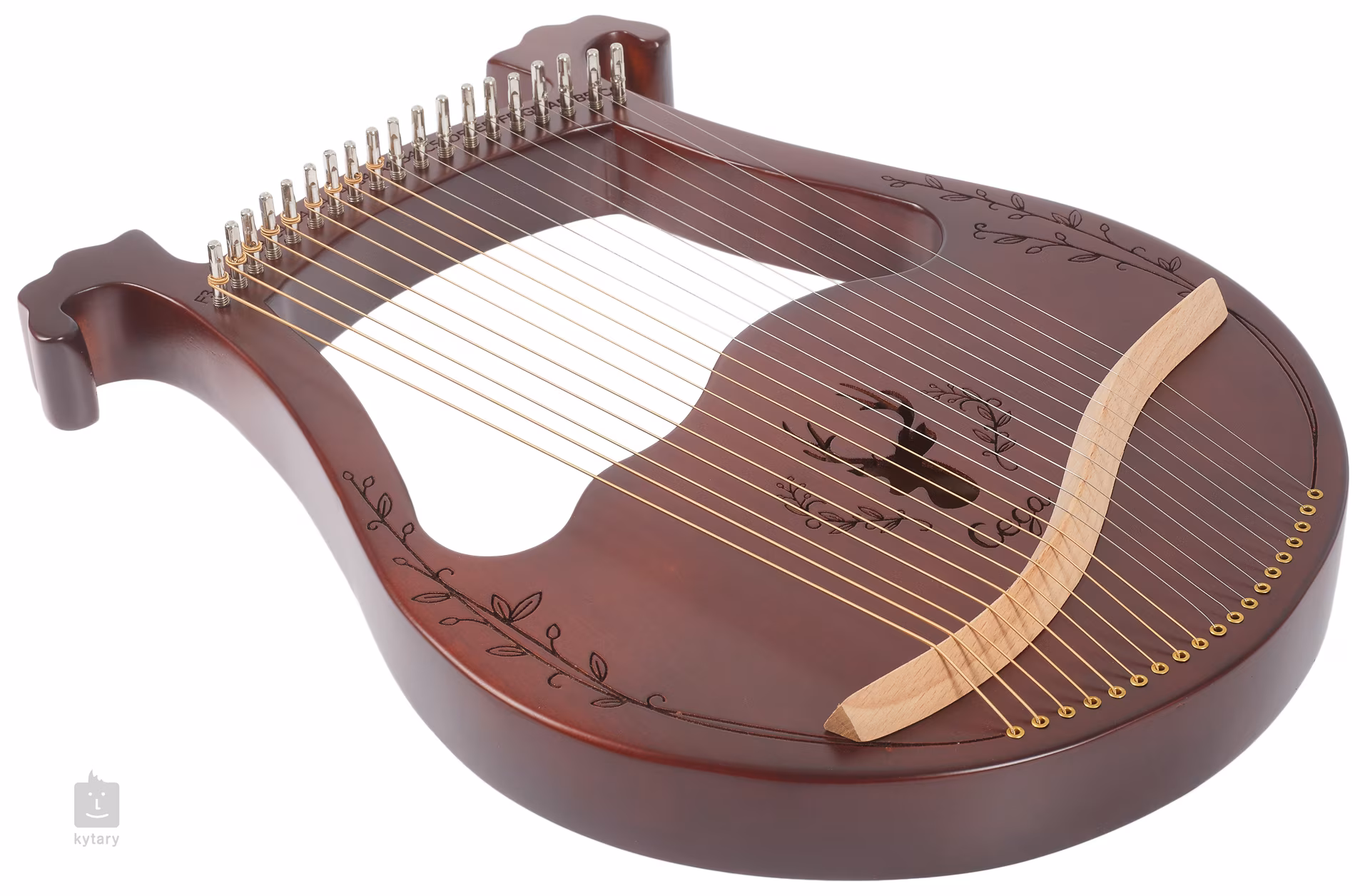 Harfa LH19C-T jest w kolorze kawy, ma dziewiętnaście strun i jest ozdobiona rzeźbieniem wokół otworu dźwiękowego w kształcie jelenia.