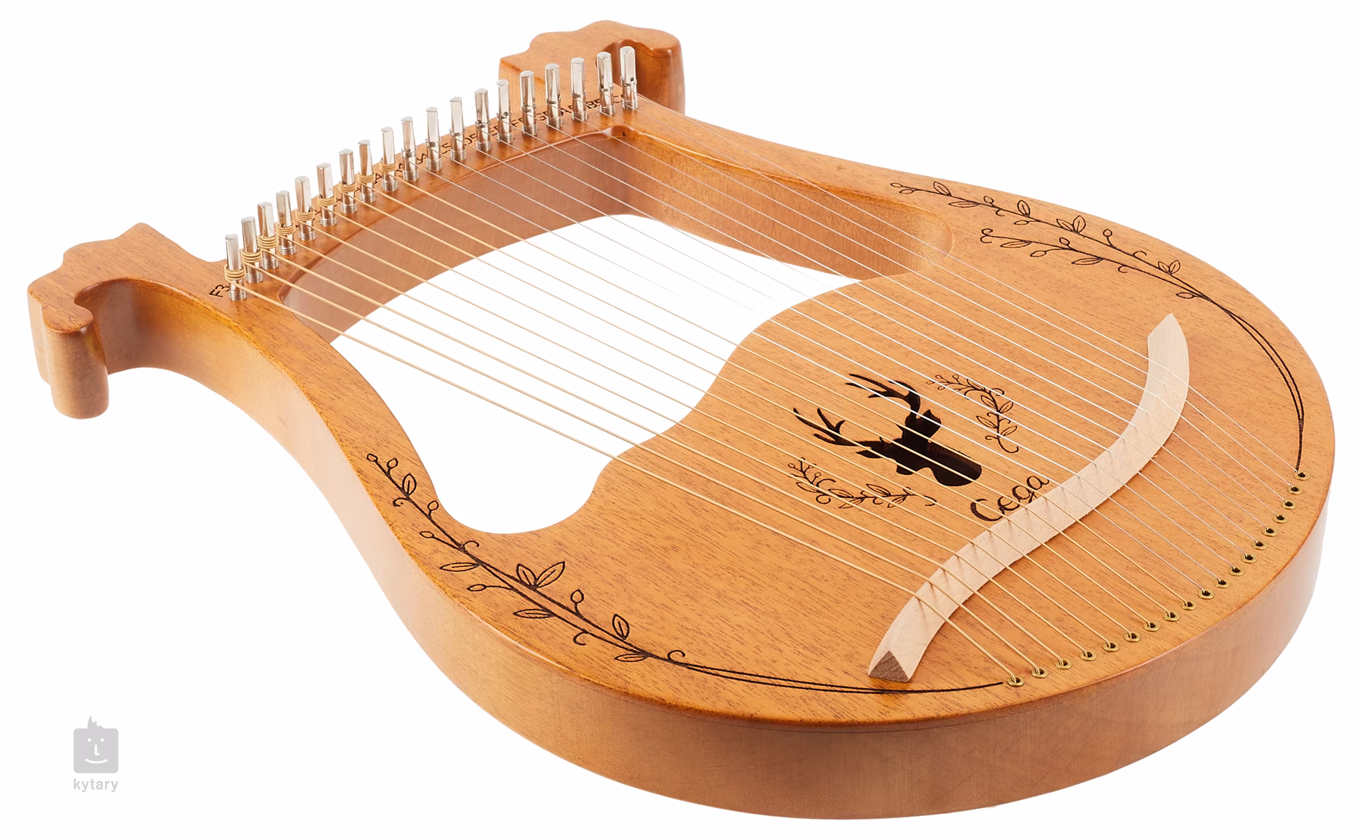 Harfa LH19W-T ma naturalny kolor, dziewiętnaście strun i jest ozdobiona rzeźbieniem wokół otworu dźwiękowego w kształcie jelenia.