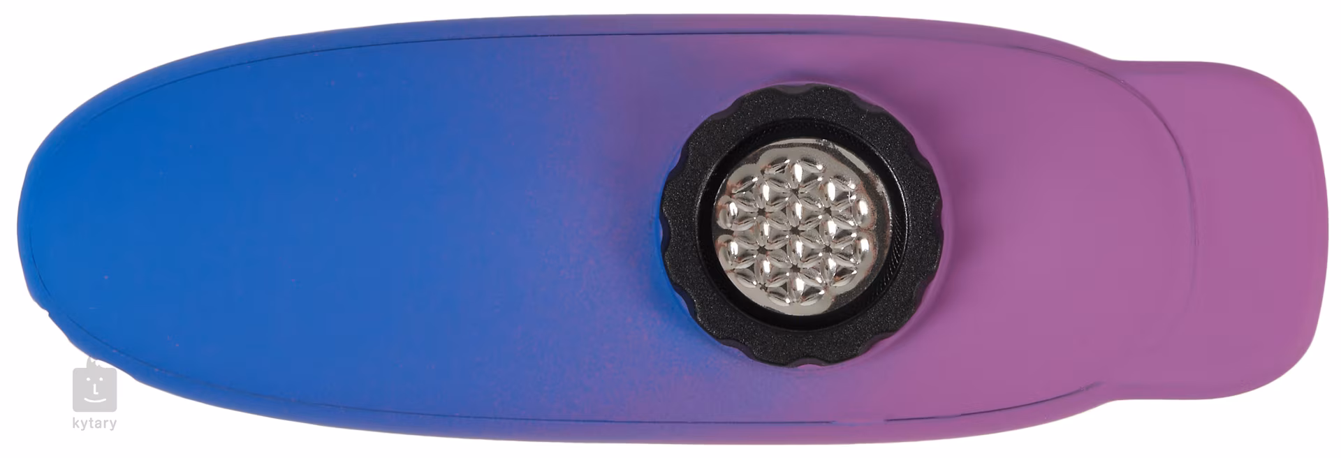 Klasyczne plastikowe kazoo. Obracając pokrywę można regulować napięcie membrany i zmieniać reakcję dźwiękową kazoo.