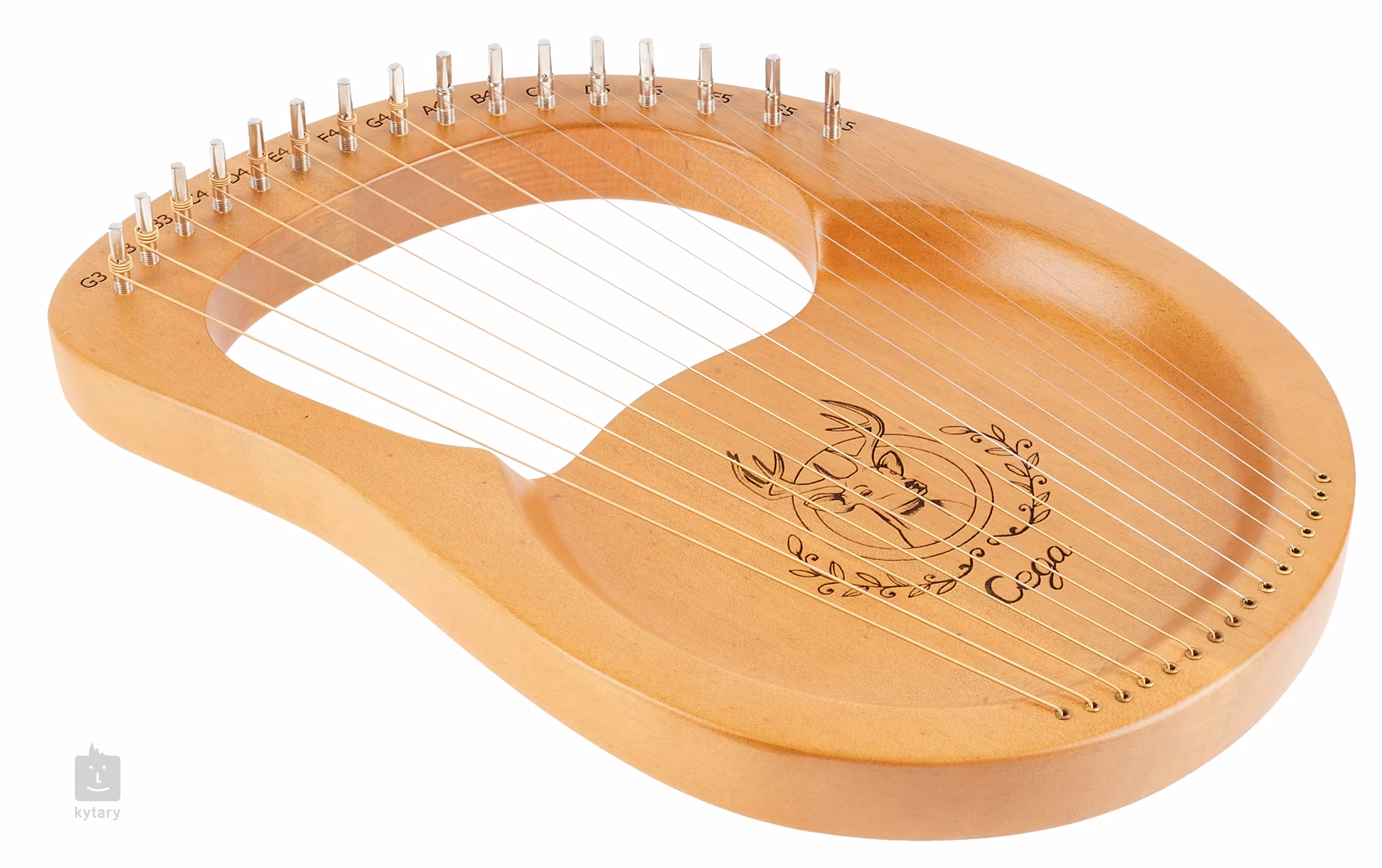 Gitara Lyra LH16W-P jest w kolorze naturalnego drewna, posiada szesnaście strun i jest ozdobiona rzeźbą jelenia.