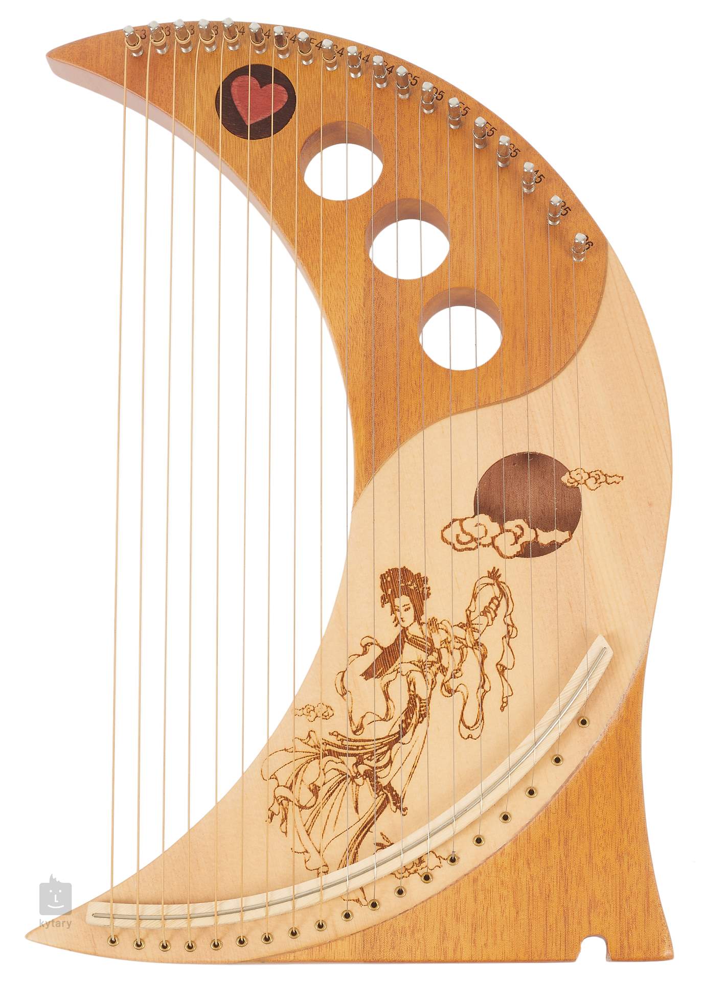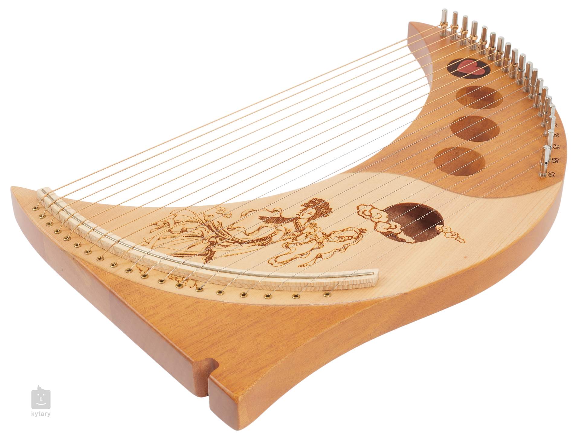 Harfa BLHM19-W ma naturalny kolor, posiada dziewiętnaście strun i jest ozdobiona rzeźbieniami poniżej otworów dźwiękowych.