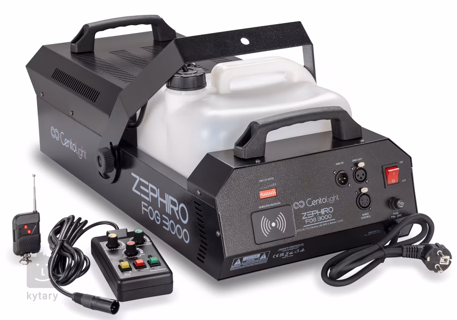 Dużą zaletą Zephiro Fog 3000 jest również wejście DMX i możliwość bezprzewodowego sterowania. Oprócz samego generatora, w zestawie znajduje się również kabel zasilający, pilot, pilot bezprzewodowy i uchwyt generatora z śrubami.