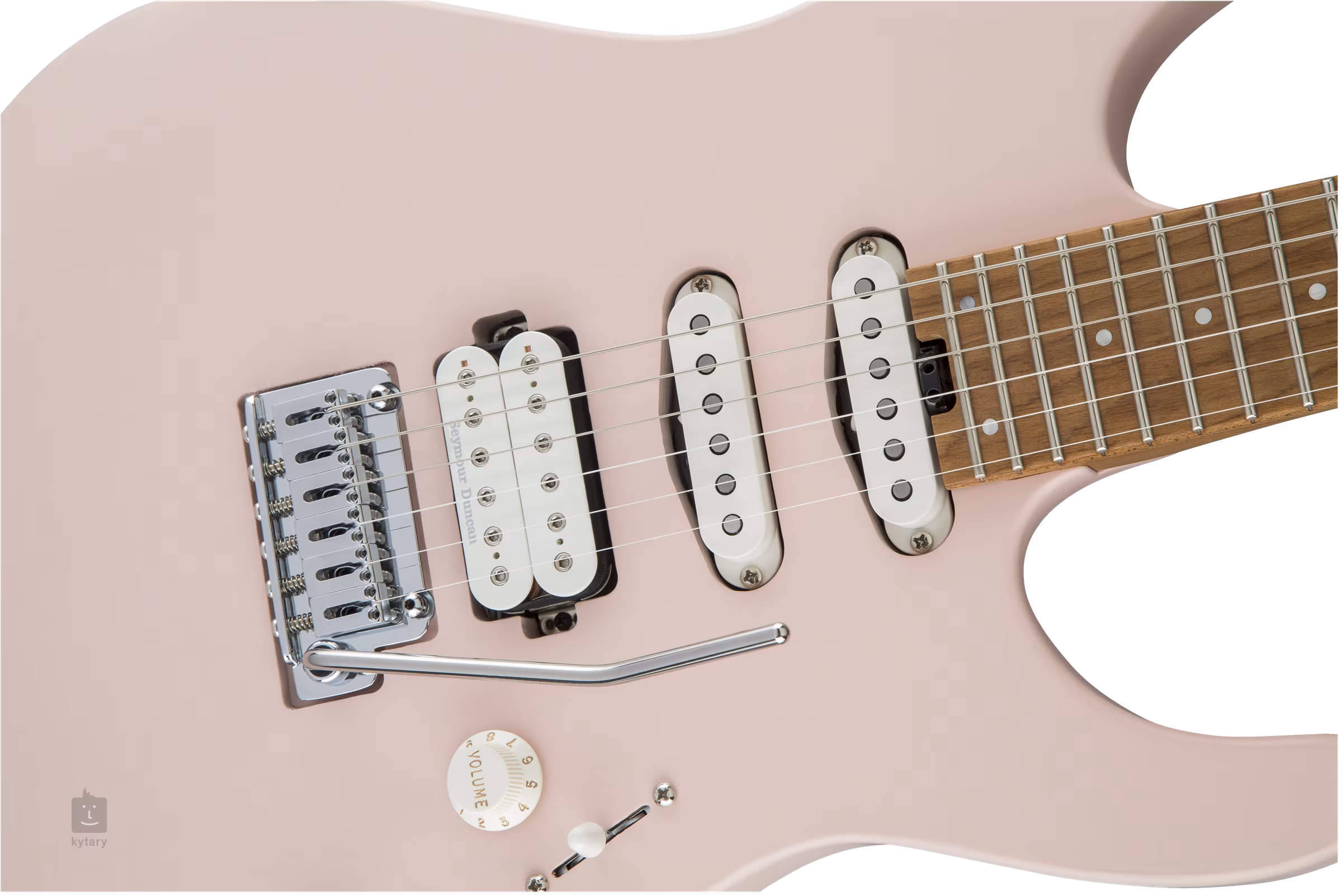 Gitara elektryczna Charvel Pro-Mod DK24 HSS 2PT CM Satin Shell Pink posiada konstrukcję korpusu typu Dinky/Superstrat.