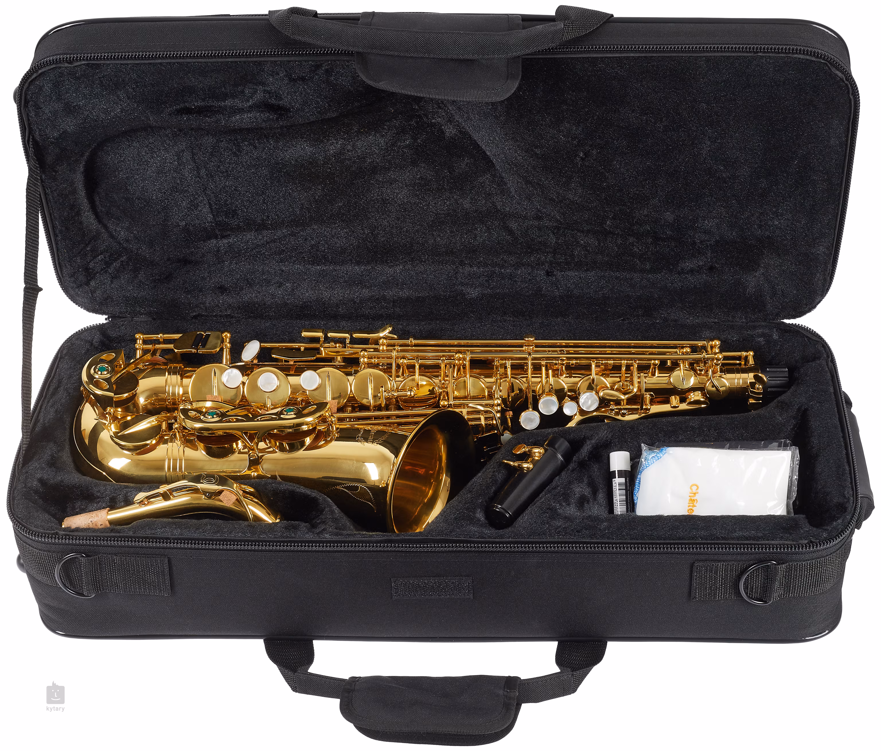 Saksofon altowy Chateau CAS-22GL o tradycyjnym, prostym designie jest idealnym wyborem dla początkujących saksofonistów i uczniów szkół muzycznych. Jest to przystępny cenowo saksofon z mosiężnym korpusem, "żebrowaną" konstrukcją z mechaniką najpierw przylutowaną do mosiężnej płytki (żebra), a następnie do korpusu, wysoką klapą Fis, inkrustacją z masy perłowej, grawerowaniem na płycie rezonansowej i wykończeniem złotym lakierem.