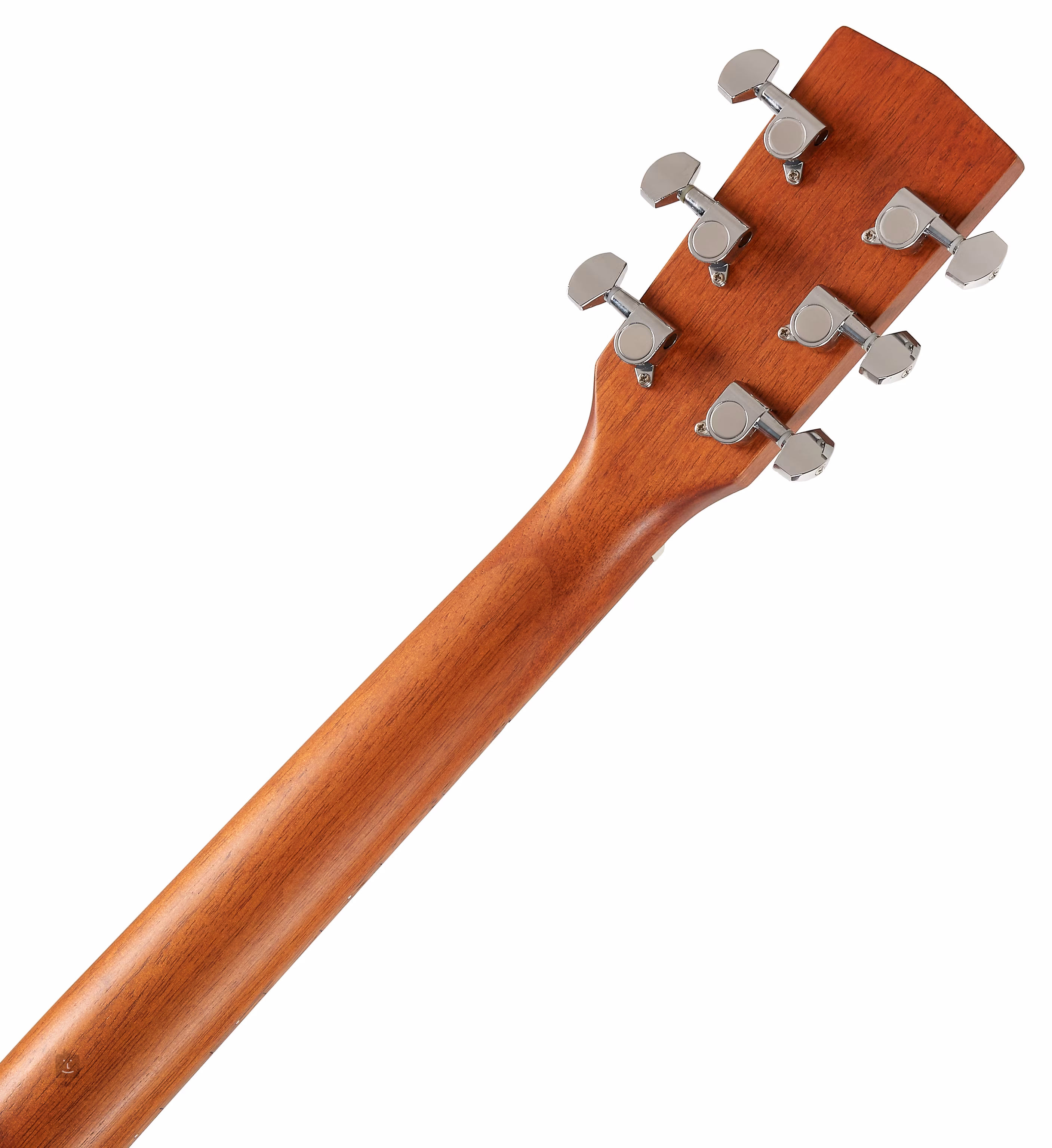 Mocowanie strun w specjalnie ukształtowanej podstrunnicy z drewna merbau i chromowanej obudowie die-cast zapewnia dobry sustain i stabilność stroju. Tradycyjne elementy wzornictwa uzupełnia rozeta złożona z czarnych pierścieni oraz praktyczny czarny pickguard, chroniący lakier gitary przed zarysowaniami.