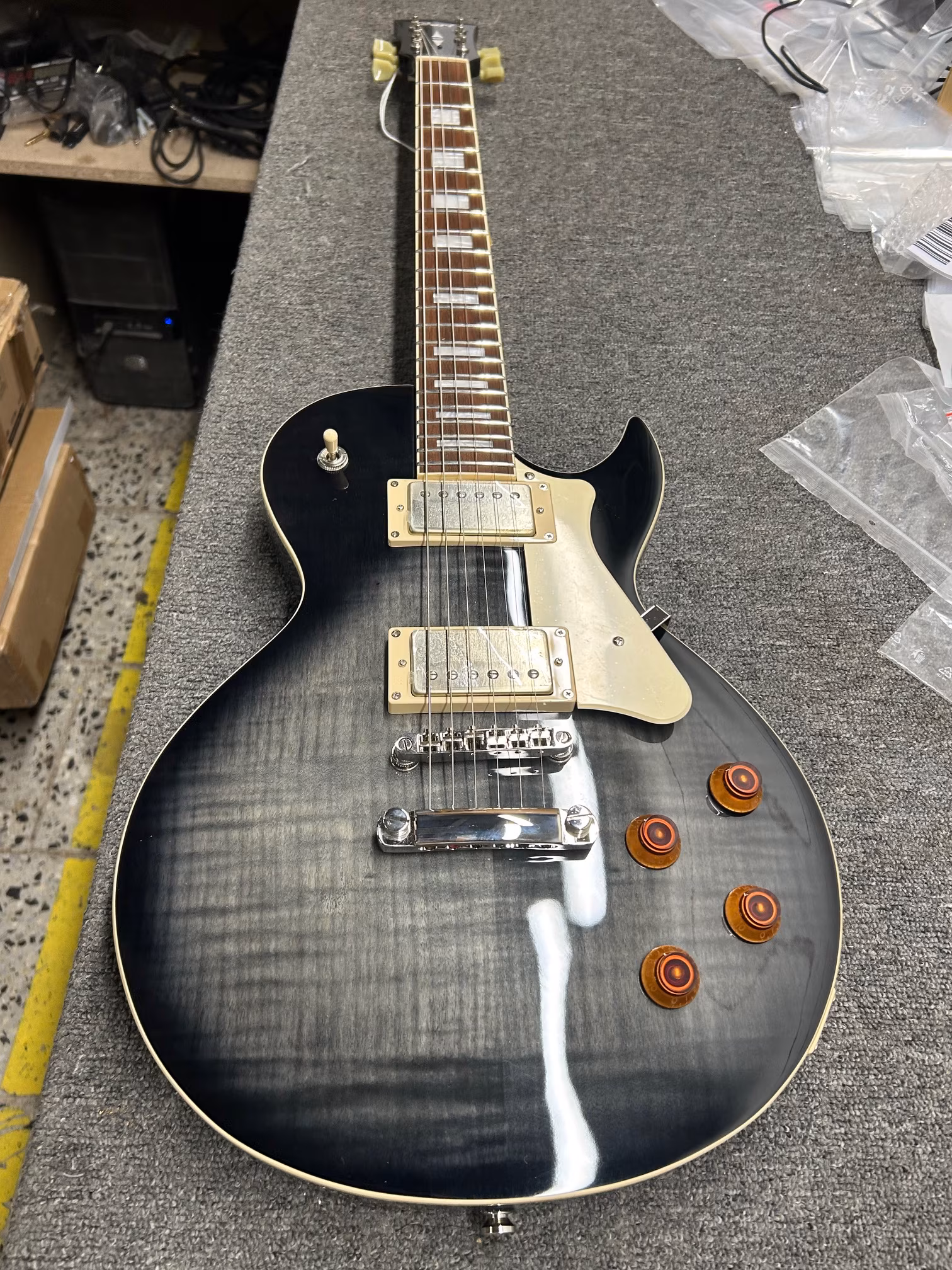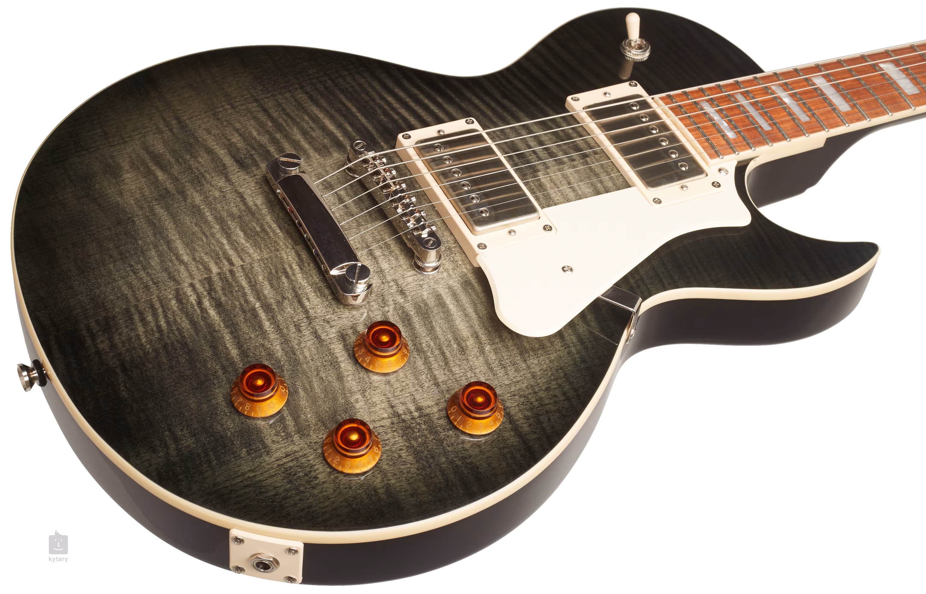 Cort CR250 to gitara elektryczna typu single-cut, która dzięki przystępnej cenie i wysokiej jakości wykonania z pewnością przypadnie do gustu zarówno młodym adeptom rockowej sztuki, jak i doświadczonym, technicznie biegłym gitarzystom. Mahoniowy korpus gitary zdobi efektowna okleina z klonu fladrowanego. Do mahoniowego gryfu przyklejono podstrunnicę z drewna jatoba z dwudziestoma progami. Orientację na podstrunnicy ułatwiają blokady pozycyjne z imitacji masy perłowej. Dwa przetworniki PAF inspirowane humbuckerami Voiced Tone VTH-59 z magnesami Alnico II zapewniają gitarze pełne rockowe brzmienie, ale w razie potrzeby również ładny czysty dźwięk. Do jego regulacji służą potencjometry głośności, tonów i trzypozycyjny przełącznik przetworników. Przeprowadzenie strun przez zerowy próg z materiału Graphtech NuBone i zamocowanie w strunociągu za pomocą stałego mostka Tune-O-Matic gwarantuje optymalne przenoszenie drgań strun do korpusu instrumentu. Stylowy wygląd instrumentu podkreślają stroiki w stylu vintage, niklowy osprzęt, jasna płytka ochronna i logo firmy na główce gitary.
