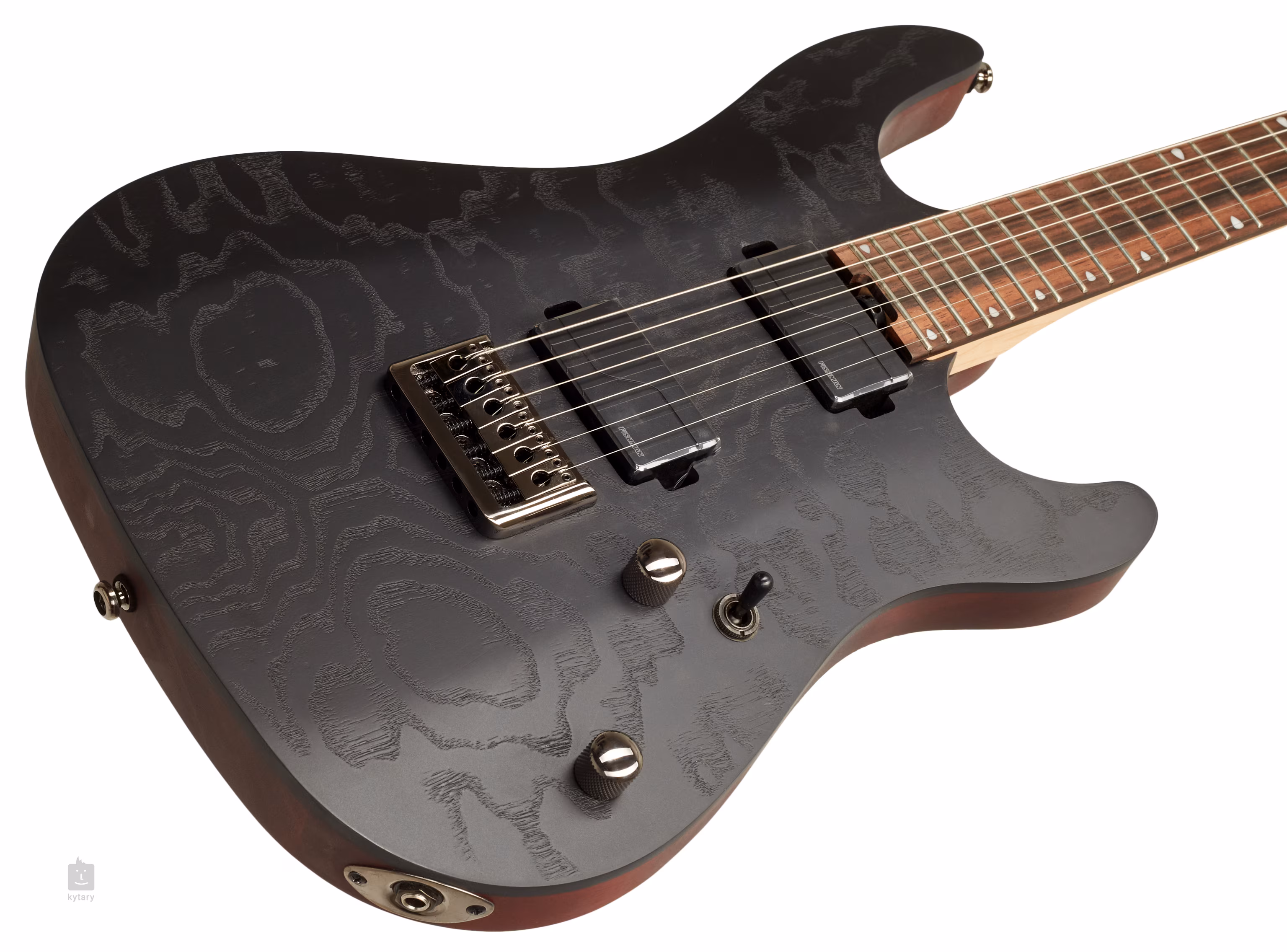 Gitara przyciąga wzrok już na pierwszy rzut oka piaskowanym jesionowym topem i wykończeniem Etched Black. Do mahoniowego korpusu przykręcona jest szyjka składająca się z pięciu kawałków klonu i purpurowego serca. Hebanowa podstrunnica Macassar, wyposażona w dwadzieścia cztery progi i markery pozycji w kształcie kropli, jest również spektakularnym elementem.