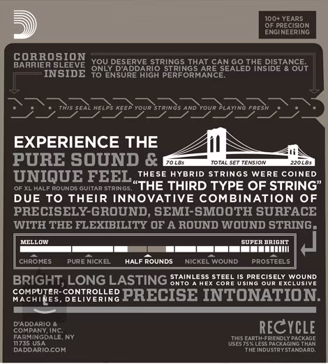 Struny do gitary elektrycznej D’addario XL Half Rounds oferują innowacyjne połączenie gładkiego i cylindrycznego nawijania. Dzięki delikatnemu wygładzeniu zapewniają one mniejszy hałas podczas gry i delikatniejsze wrażenia z gry, zachowując jednocześnie pełny i głośny dźwięk zwykłych strun. Ich podstawą jest sześciokątny stalowy rdzeń, który zapewnia doskonałą intonację, długą żywotność i spójne wrażenia podczas gry. Struny owinięte są drutem ze stali nierdzewnej, który jest precyzyjnie szlifowany, aby zapewnić najlepsze cechy obu rodzajów strun. Idealne do nagrań studyjnych i muzyki wszystkich gatunków.