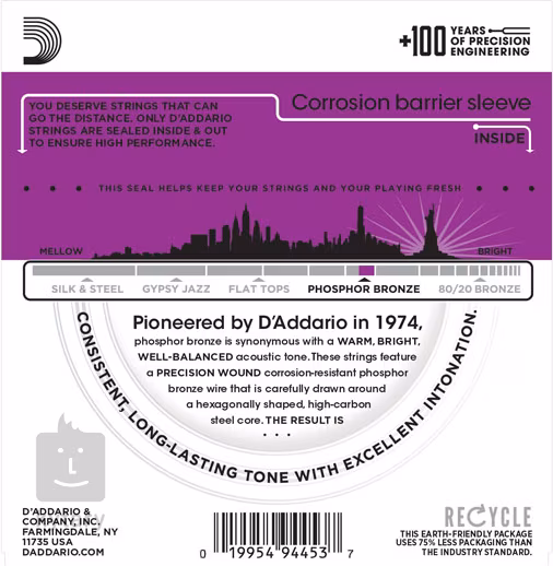 Jeśli szukasz strun do gitary akustycznej o zaokrąglonym, ciepłym brzmieniu, seria D'Addario Phosphor Bronze będzie dla Ciebie właściwym wyborem. Fosforbronz jest obecnie powszechnie stosowany do produkcji strun, ale w 1974 roku to właśnie firma D'Addario po raz pierwszy zaprezentowała ten materiał. Od tego czasu są one synonimem ciepłego, zrównoważonego częstotliwościowo brzmienia, które nadaje się do wszystkich możliwych gatunków muzycznych. Sześciokątny rdzeń stalowy o wysokiej zawartości węgla zapewnia im długą żywotność, doskonałą intonację i wspaniałe brzmienie.