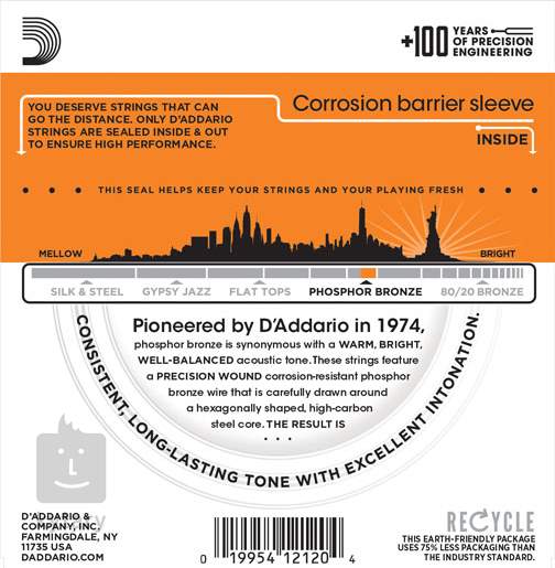 Jeśli szukasz strun do gitary akustycznej o zaokrąglonym, ciepłym brzmieniu, seria D'Addario Phosphor Bronze będzie dla Ciebie właściwym wyborem. Fosforbronz jest obecnie powszechnie stosowany do produkcji strun, ale w 1974 roku to właśnie firma D'Addario po raz pierwszy zaprezentowała ten materiał. Od tego czasu są one synonimem ciepłego, zrównoważonego tonu, który nadaje się do wszystkich możliwych gatunków muzycznych. Sześciokątny rdzeń stalowy o wysokiej zawartości węgla zapewnia im długą żywotność, doskonałą intonację i piękny ton. W tym opakowaniu znajdziesz struny do gitary dwunastostrunowej o twardości 9.