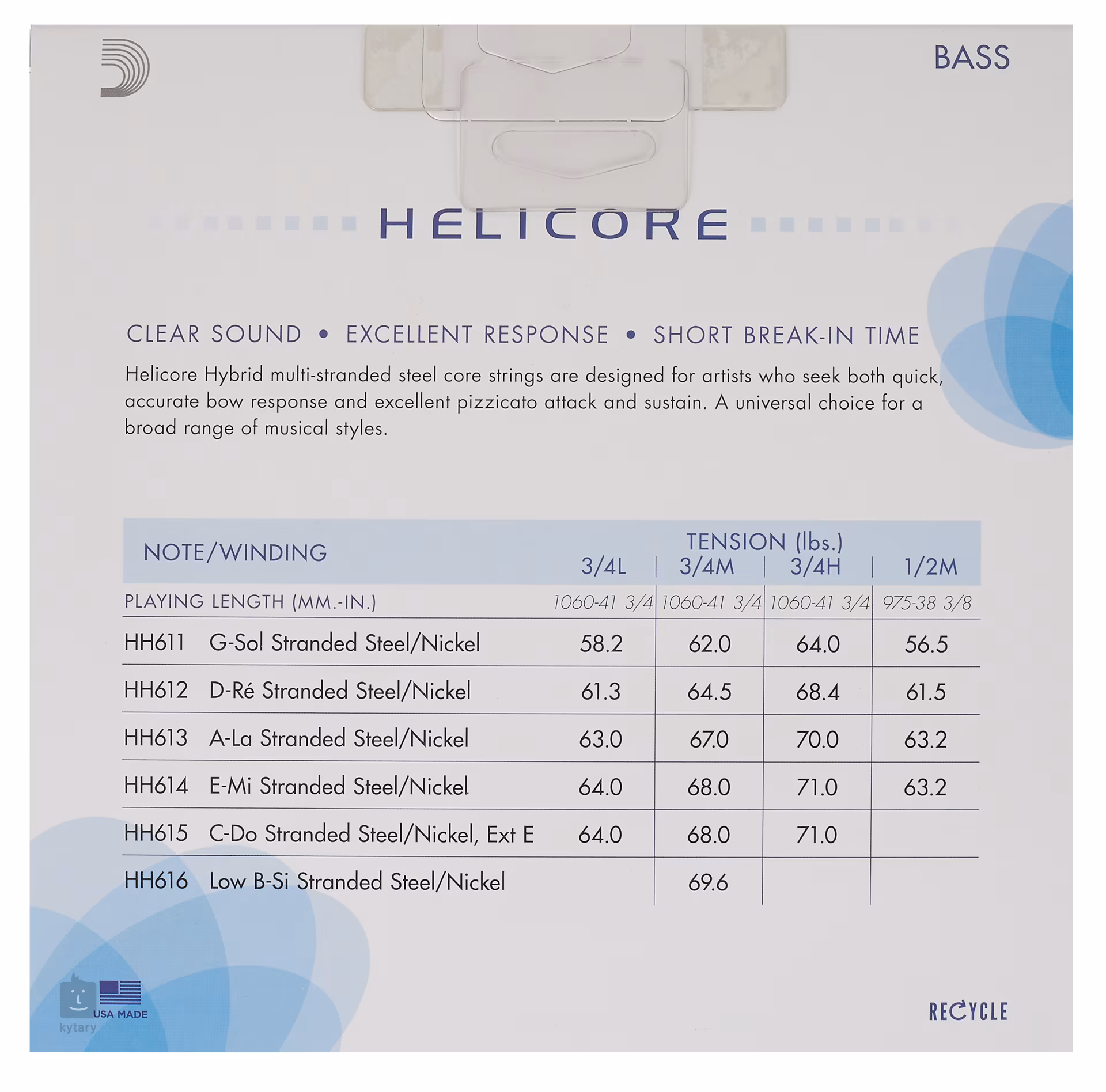 Struny Helicore Hybrid składają się z wielu włókien stalowych i wytwarzają jasne, średnio ciepłe brzmienie. Tłumienie strun jest dostosowane zarówno do gry pizzicato jak i smyczkowej. Dzięki temu struny te są bardzo uniwersalne i mogą być używane w wielu stylach muzycznych.