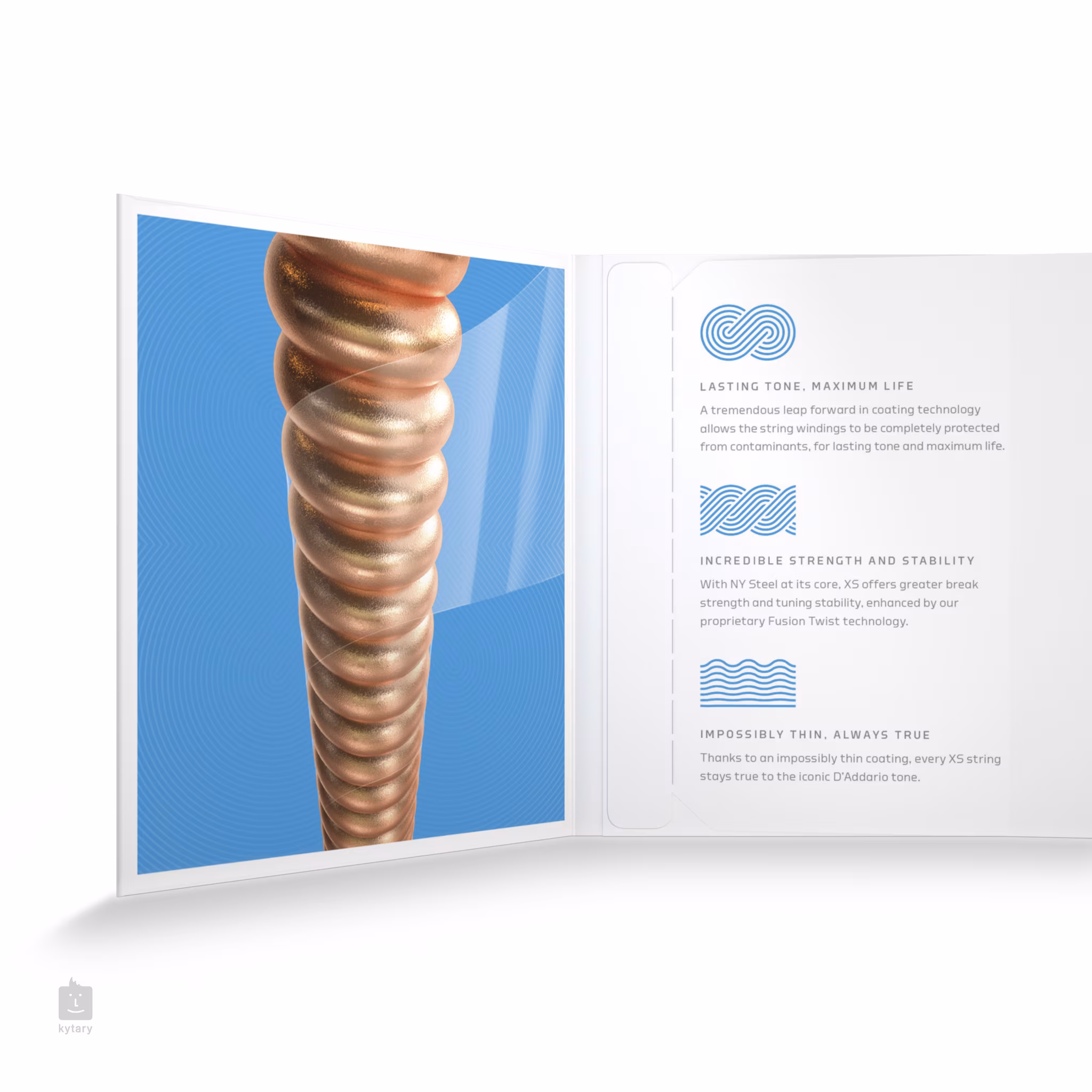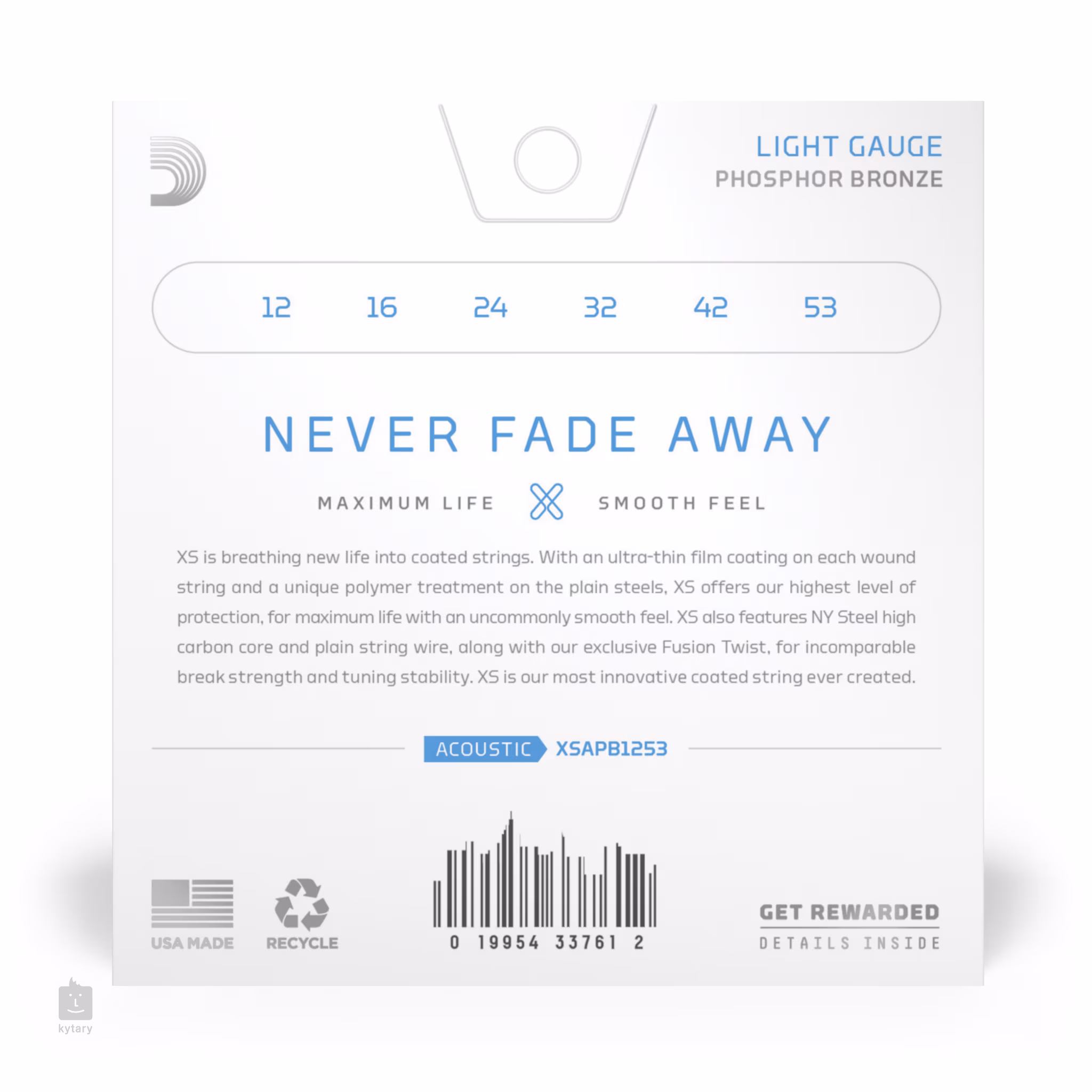 Najwyższa seria strun XS firmy D'Addario stanowi przełom technologiczny w dziedzinie strun powlekanych i należy do najlepszych produktów, jakie można znaleźć w katalogu tej znanej na całym świecie firmy. Struny te łączą w sobie najlepsze cechy serii XT, ale podnoszą poprzeczkę jeszcze wyżej. Niezwykle cienka powłoka zapewnia im niezrównaną trwałość i przyjemnie gładką powierzchnię, nie umniejszając przy tym doskonałych właściwości dźwiękowych, z których słyną struny D'Addario. Dzięki sześciokątnemu rdzeniowi stalowemu o wysokiej zawartości węgla i nawijaniu z fosforowego brązu oferują ciepłe i potężne brzmienie z wyważonym udziałem wszystkich częstotliwości, długim sustainem i doskonałą dynamiką. Jednocześnie charakteryzują się doskonałą stabilnością strojenia i wysoką odpornością. Są to po prostu struny najwyższej jakości, które będą służyć przez bardzo długi czas. W tym opakowaniu znajdziesz struny o twardości 12–53, które zapewniają mocne brzmienie i przebicie.