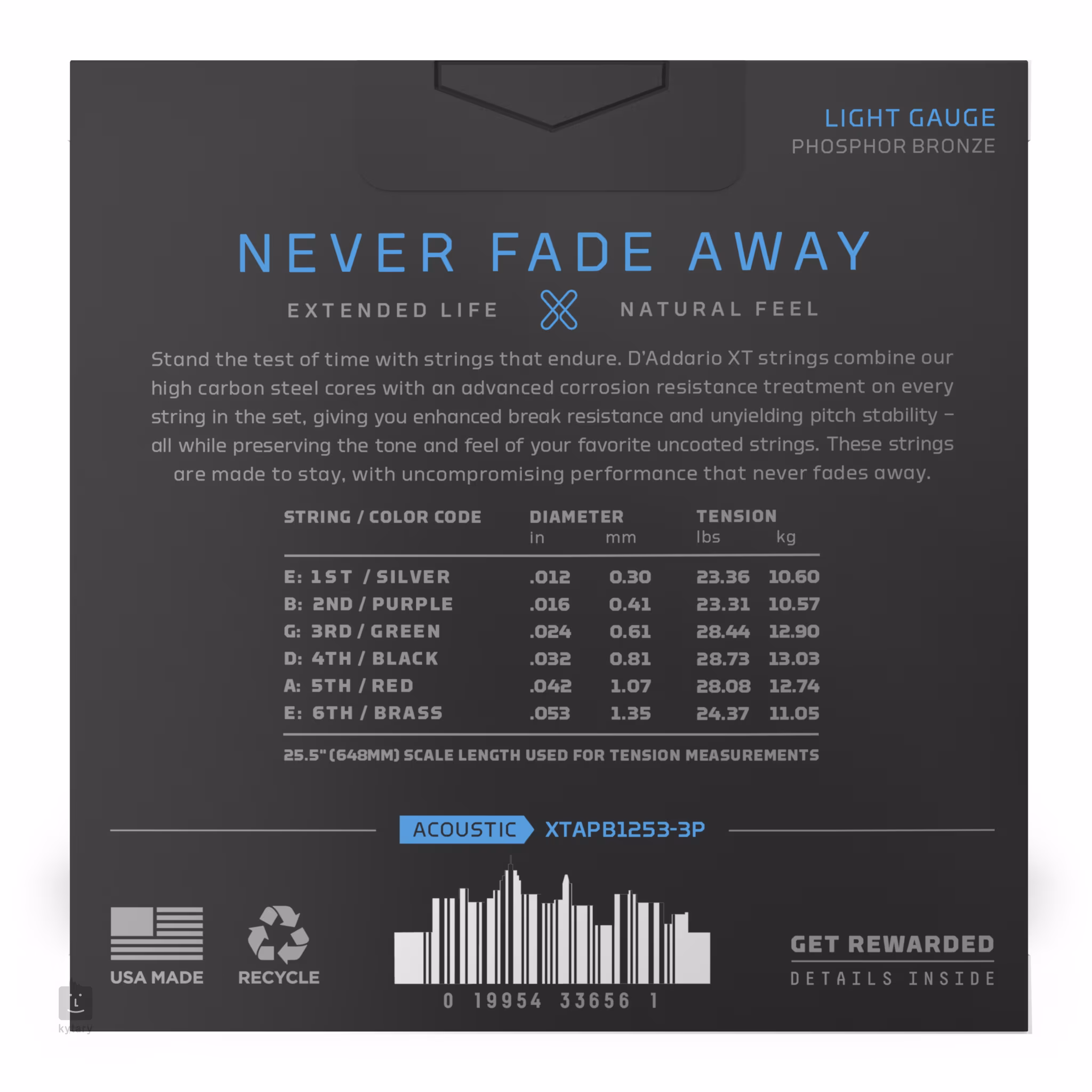W tym opakowaniu znajdziesz trzy zestawy strun z brązu fosforowego D'Addario XT o twardości 12-53.
