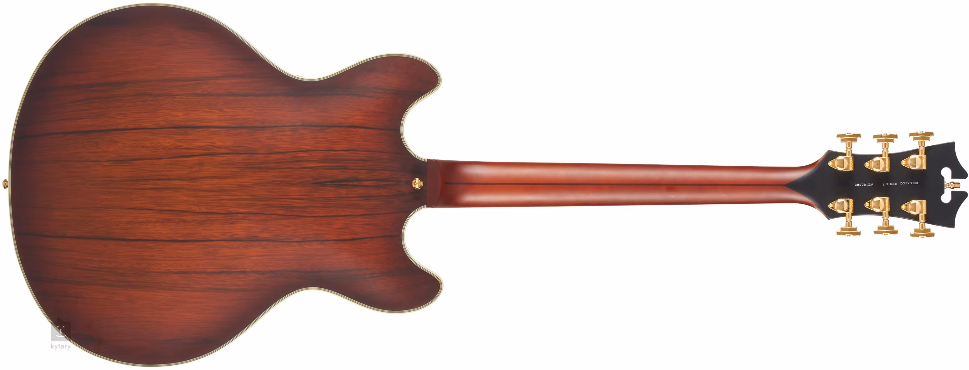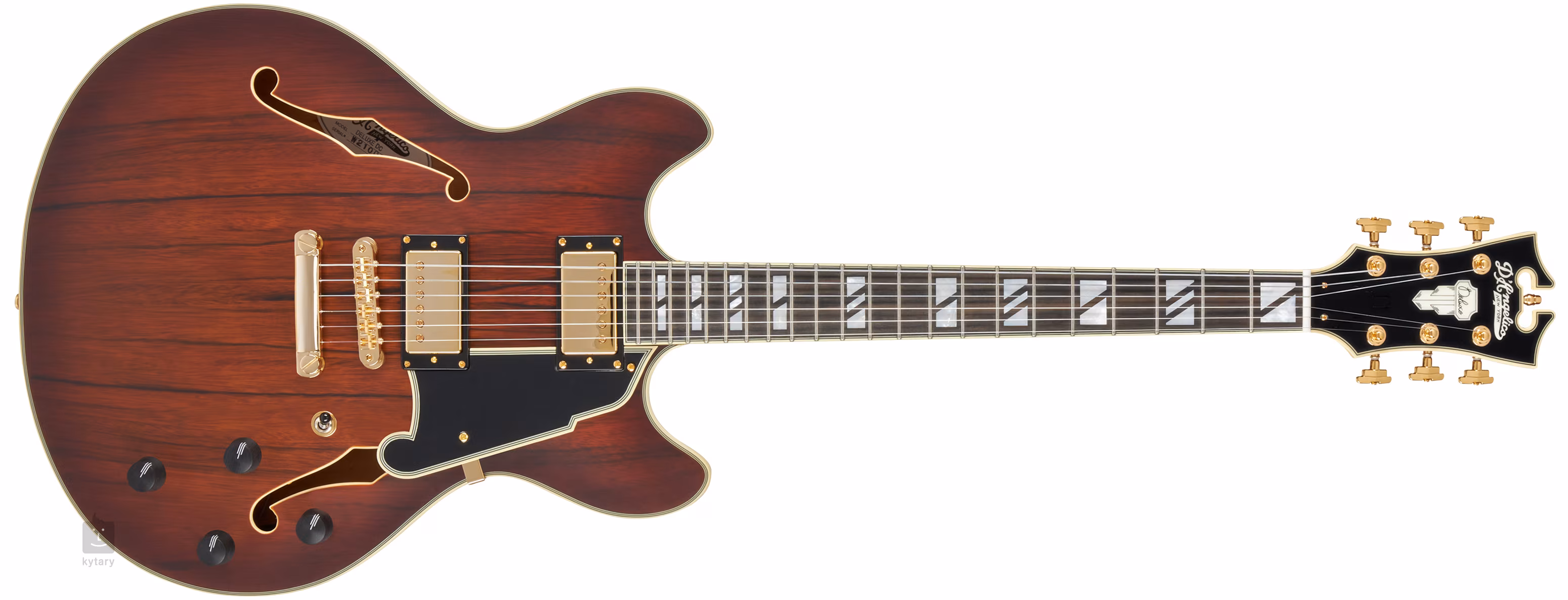 D'Angelico Deluxe DC Satin Brown Burst to gitara typu semi-hollowbody w konstrukcji double-cut. Jej korpus o szerokości szesnastu cali wykonany jest z laminowanego drewna dao/paldao o charakterystycznym usłojeniu. Lekki blok środkowy usztywnia płytę rezonansową i przeciwdziała niepożądanemu efektowi "wiązania" korpusu.