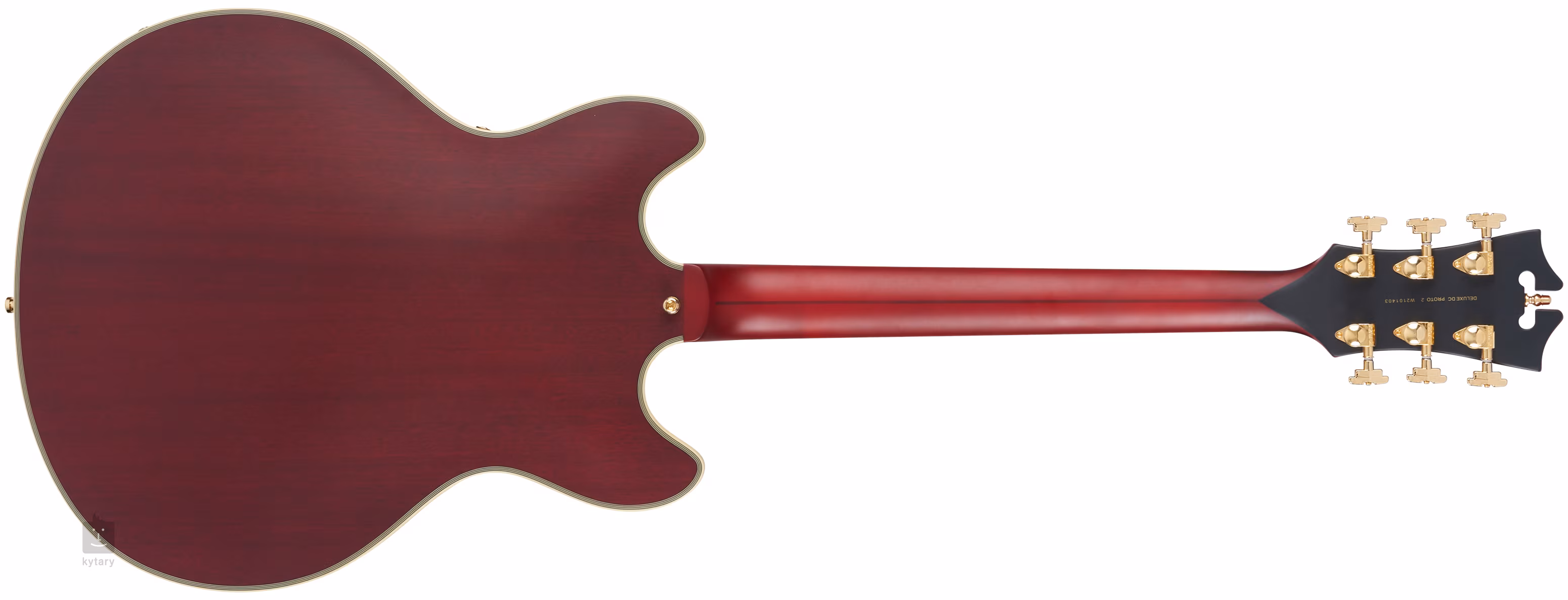 D'Angelico Deluxe DC Trans Wine to gitara typu semi-hollowbody w konstrukcji double-cut. Jej korpus o szerokości 16 cali wykonany jest z laminowanego mahoniu. Lekki blok środkowy usztywnia płytę rezonansową i przeciwdziała niepożądanemu efektowi "bindowania" miecha.