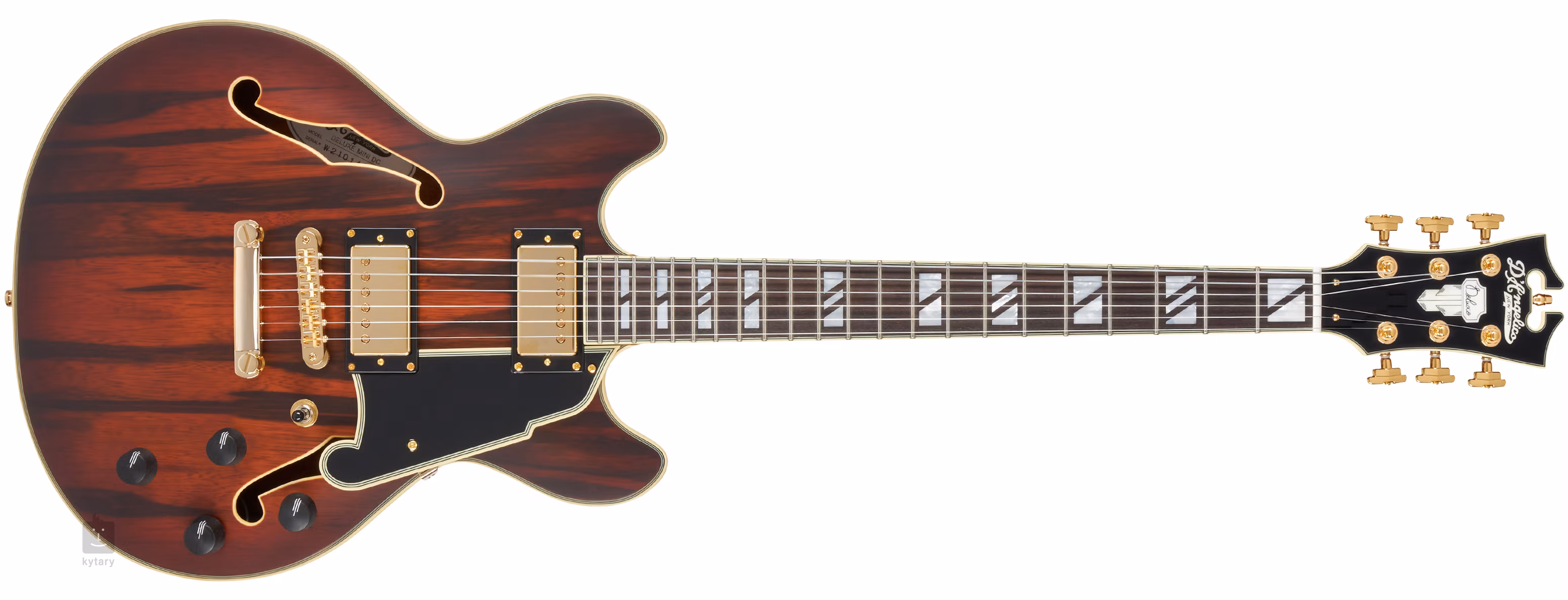 D'Angelico Deluxe Mini DC Satin Brown Burst to gitara typu semi-hollowbody w konstrukcji double-cut ze zmniejszonym korpusem (14 cali szerokości - 355 mm). Z pewnością spodoba się muzykom, którzy uważają, że tradycyjne gitary semi-hollowbody są zbyt masywne. Korpus gitary wykonany jest z laminowanego drewna dao/paldao o charakterystycznym usłojeniu. Lekki blok centralny usztywnia płytę rezonansową i przeciwdziała niepożądanemu efektowi "bindowania" korpusu.