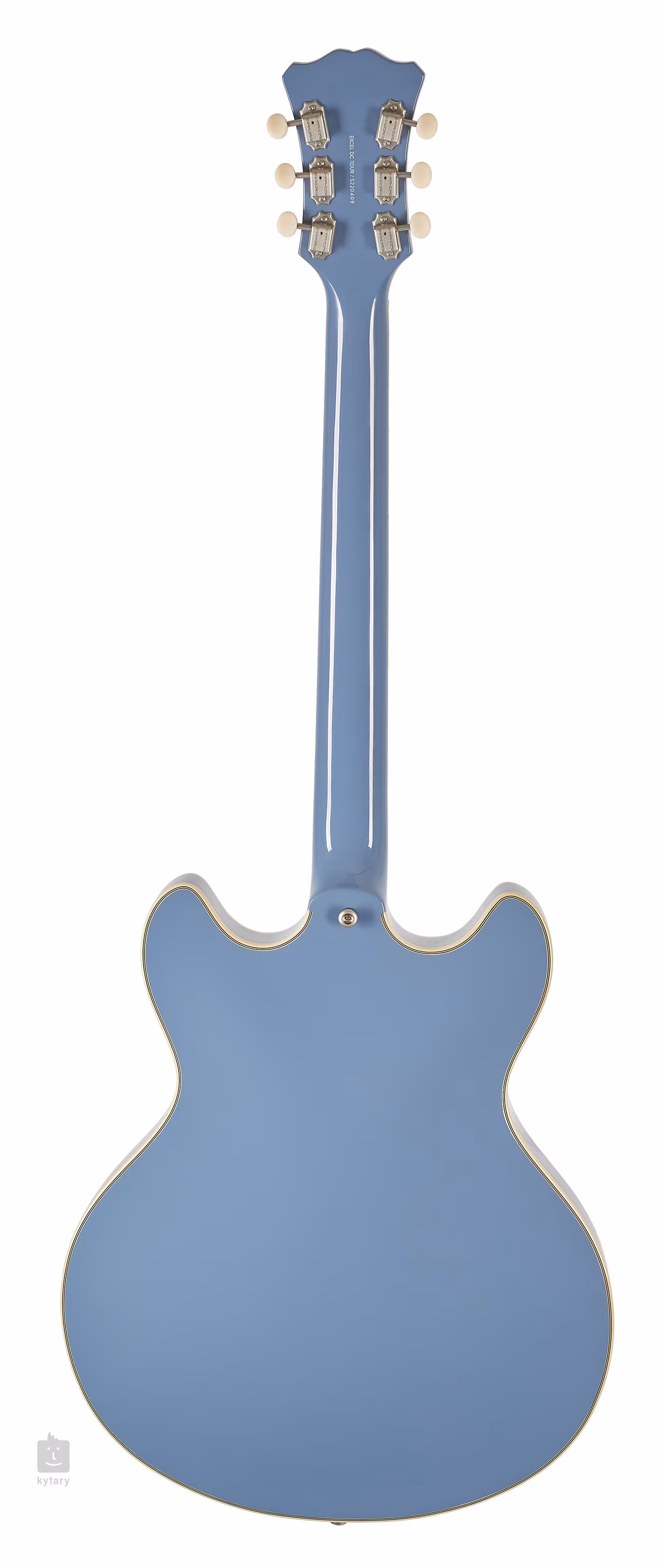 Double Cutaway w/ stop-bar tailpiece blue to gitara typu semi-hollowbody z dwoma wycięciami i korpusem o szerokości szesnastu cali wykonanym z laminowanego klonu i litego bloku środkowego. Do klonowej szyjki przyklejona jest hebanowa podstrunnica wyposażona w dwadzieścia dwa progi Medium Jumbo. Wąski profil C szyjki zapewnia płynny ruch palców na podstrunnicy i wygodny chwyt palców, a znaczniki pozycji wykonane z imitacji masy perłowej ułatwiają orientację na powierzchni podstrunnicy.