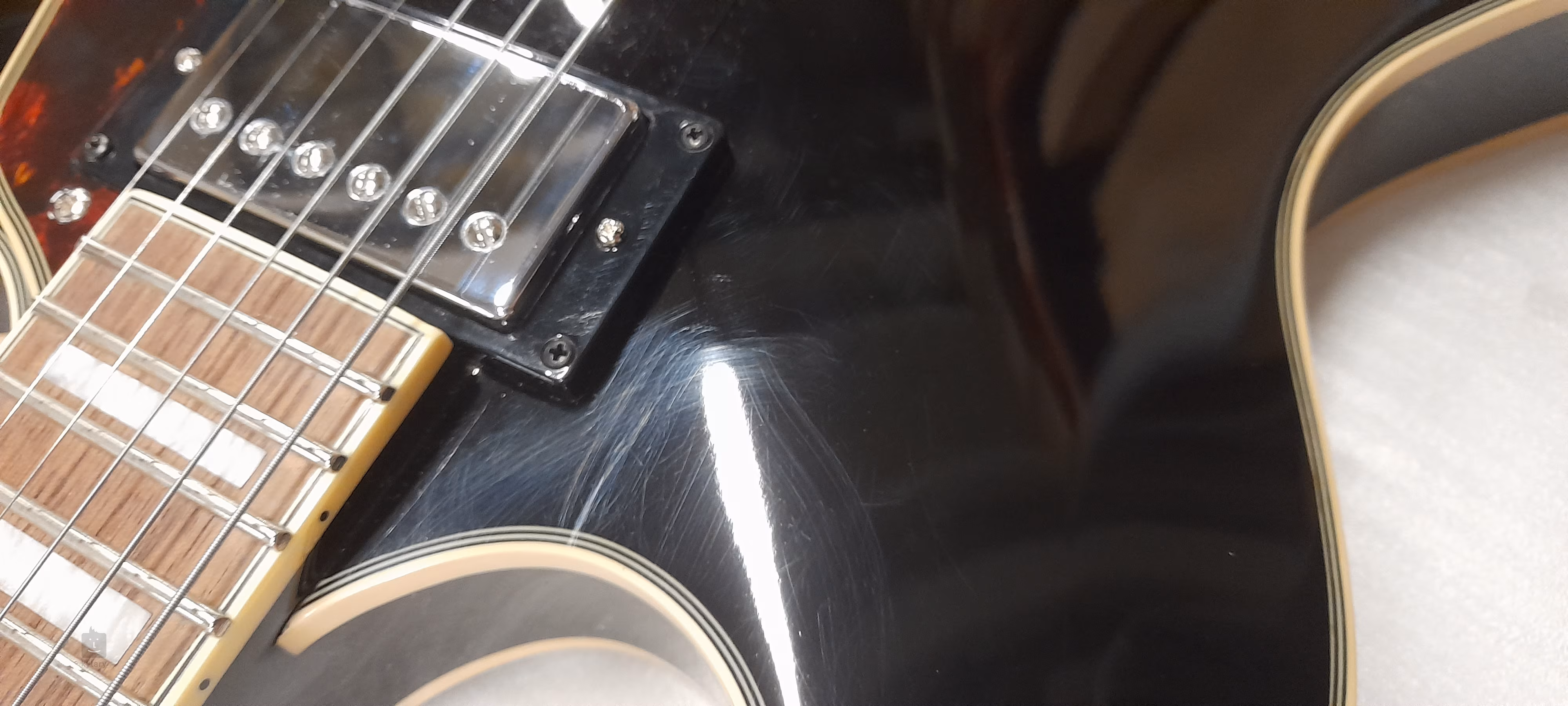 Seria Premier tobardziej przystępne cenowo instrumenty z portfolio firmy D'Angelico, które jednak spełniają wszystkie wymagania dotyczące jakości wykonania związane z tą marką. Model półakustyczny DC jest odpowiedzią firmy na rosnące zapotrzebowanie na gitary z dwoma wycięciami. Półpółokrągła konstrukcja modelu Premier DC Black jest wykonana z laminowanego klonu i środkowego bloku, który wzmacnia przednią płytę i tłumi niepożądany efekt „drgania” korpusu. Do klonowego gryfu przyklejono palisandrową podstrunnicę z dwudziestoma progami z pakfongu (niklowo-srebrnego) w rozmiarze Medium Vintage. Wąski profil szyjki w kształcie litery C zapewnia płynny ruch palców po gryfie i wygodny dotyk, a orientację na gryfie ułatwiają blokady pozycyjne z imitacji masy perłowej. Dwa firmowe humbuckery zoptymalizowane pod kątem kształtu korpusu Mini DC zapewniają gitarze ciepłe, świeże brzmienie, które zadowoli zarówno miłośników czystego tonu, jak i bardziej rockowego przesterowania/overdrive. Instrument sprawdzi się więc zarówno w jazzie, bluesie i fusion, jak i współczesnym rocku. Charakter brzmienia można kształtować za pomocą potencjometrów głośności i tonu z hebanowymi nakładkami oraz trzypozycyjnego przełącznika przetworników. Korpus gitary równoważy typowa dla tej firmy główka w stylu Art Deco, ozdobiona perłowym logo firmy i intarsją (Mother-of-Pearl). Stabilne strojenie i dobre wybrzmienie gwarantuje mocowanie strun przez zerowy próg z materiału Graphtech NuBone XL w mechanizmach o przełożeniu 14:1 i przez mostek TOM w strunociągu. Stylowy wygląd gitary podkreśla wielowarstwowa lamówka korpusu, podstrunnicy i główki oraz pięciowarstwowa płytka ochronna Scalini.