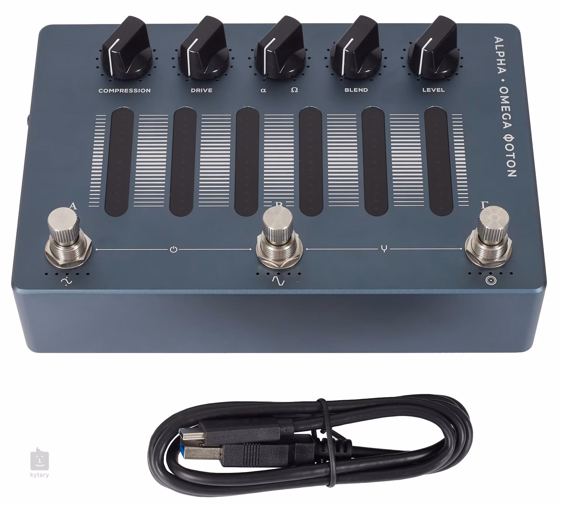 Pierwszym w linii efektów jest kompresor, który można łatwo kontrolować za pomocą jednego potencjometru. Nowa inteligentna technologia pozwala automatycznie dostosować idealne proporcje siły sygnału wejściowego do kompresji, dzięki czemu nawet przy ekstremalnych ilościach kompresji sygnał zachowuje odpowiednią intensywność. Następny w kolejce jest potencjometr Drive, który podkręca dźwięk i dodaje zniekształcenia. Można to kontrolować bardziej szczegółowo za pomocą potencjometru Mod, którego można użyć do określenia stosunku obwodów zniekształceń Alpha i Omega. Obwód Alpha zapewnia mocny, skupiony dźwięk z wyraźną definicją, podczas gdy obwód Omega ma brutalne, bezkompromisowe zniekształcenia. Jednak oprócz tego, efekt jest również w stanie przetwarzać sygnał sidechain z czystym dźwiękiem, który można następnie zmiksować ze zniekształconym sygnałem za pomocą funkcji Blend. Potencjometr Level działa wówczas jako główny regulator głośności. Wyjątkowe są również niezwykle precyzyjne suwaki dotykowe, za pomocą których można sterować sześciopasmowym programowalnym korektorem.