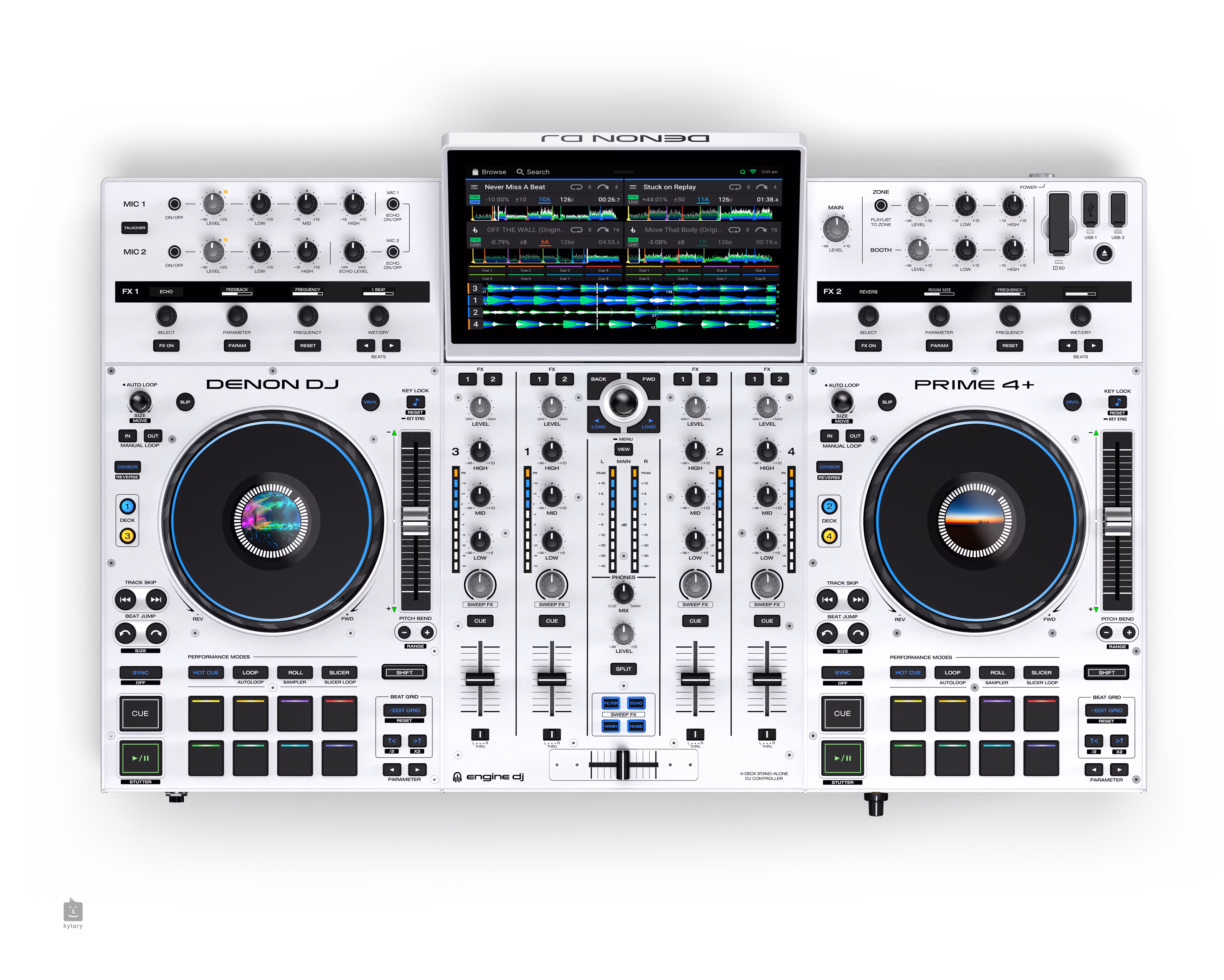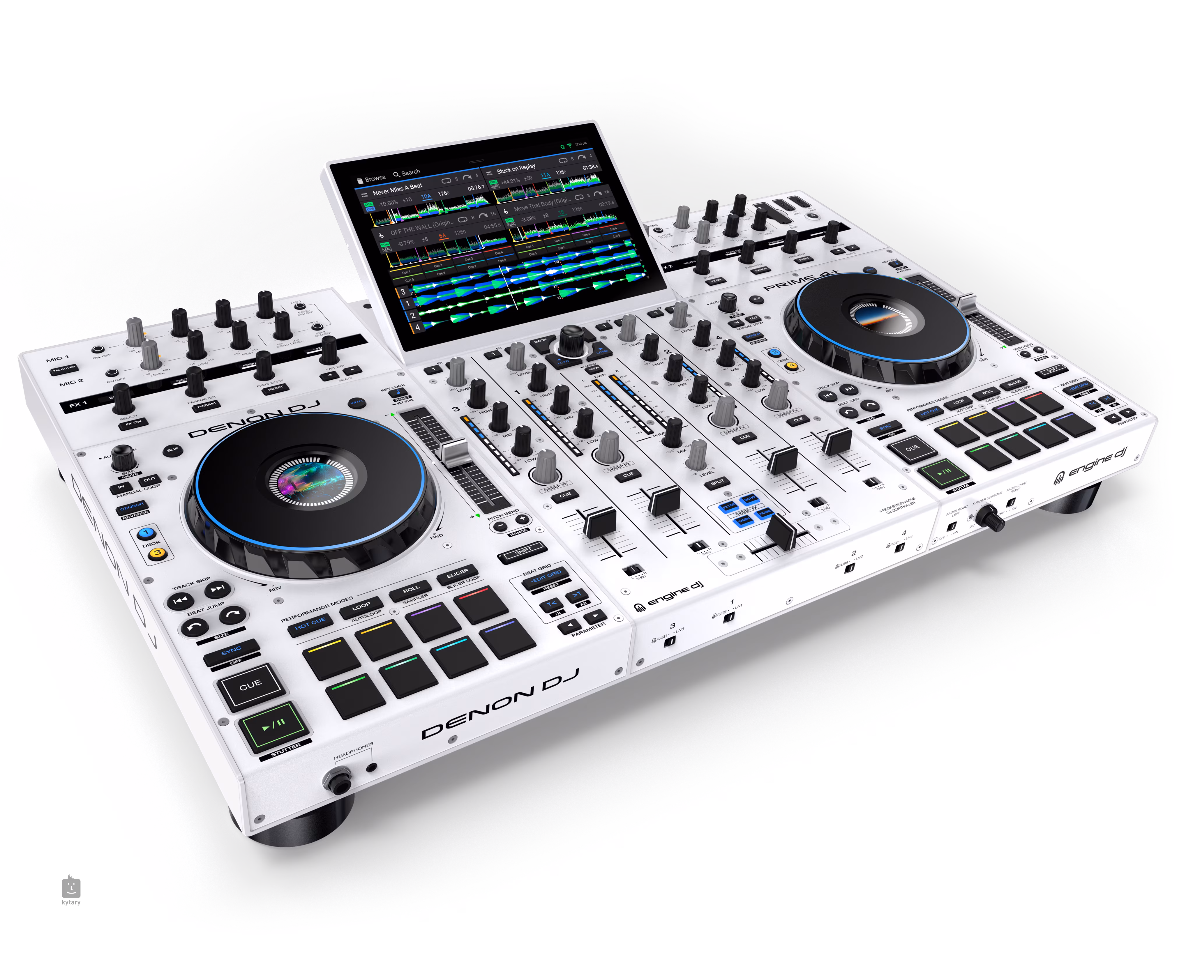 Wyświetlacz i elementy sterujące Prime 4+ posiada wbudowany 10,1-calowy ekran dotykowy HD, który umożliwia intuicyjną obsługę i szybki dostęp do wszystkich funkcji i ustawień. Ergonomiczna konstrukcja i przejrzysty interfejs ułatwiają nawigację po bibliotece ścieżek, efektów, pętli i innych narzędzi miksujących. Koła jog o średnicy 6" posiadają podświetlenie RGB i centralne wyświetlacze. Dostępnych jest również 16 padów RGB, które obsługują różne tryby dla kreatywnych możliwości.