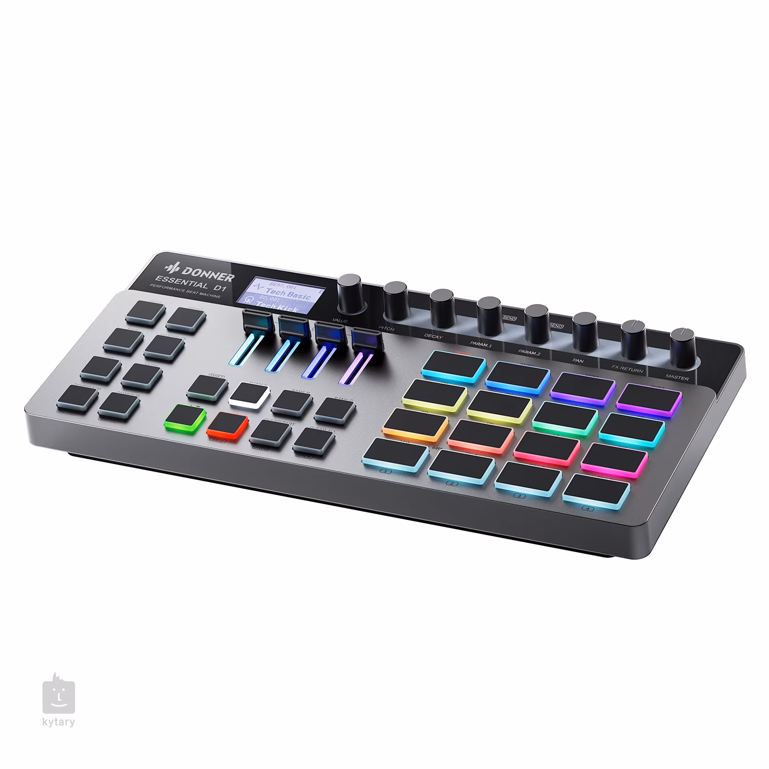 Sercem instrumentu jest 16 czułych na prędkość padów RGB, które pozwalają na ekspresyjną i naturalną grę. Kolorowe podświetlenie ułatwia nawigację i dostosowuje się do potrzeb gracza. Do sterowania parametrami, efektami lub głośnością służą 4 fadery RGB, które rozszerzają kreatywne możliwości. Zintegrowany sekwencer krokowy obsługuje do 128 ścieżek, 512 beatów i 64 kroki na pattern, dając użytkownikowi swobodę w aranżacji. Czytelny wyświetlacz LCD o rozdzielczości 128×64 pikseli ułatwia nawigację i pracę z samplami.