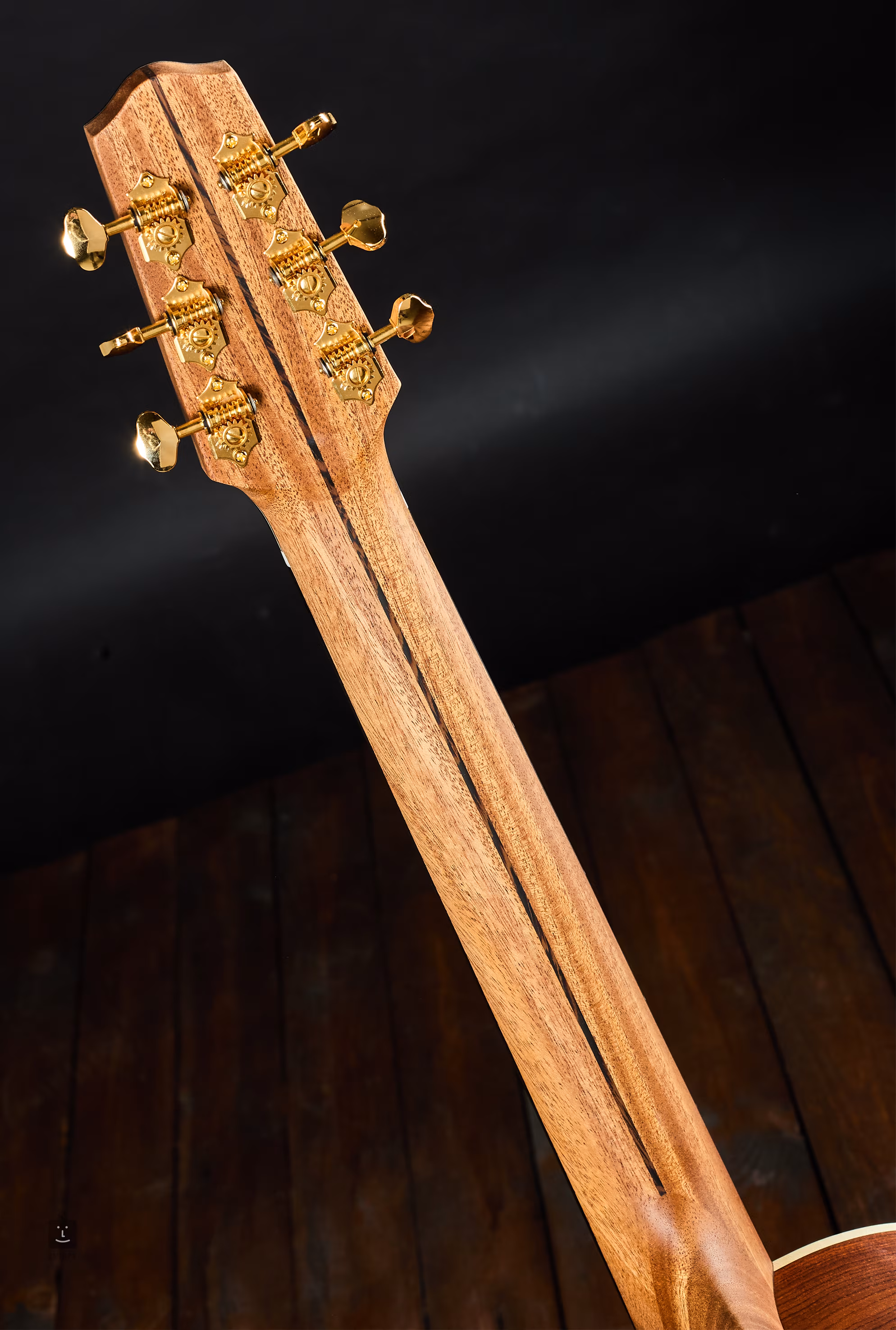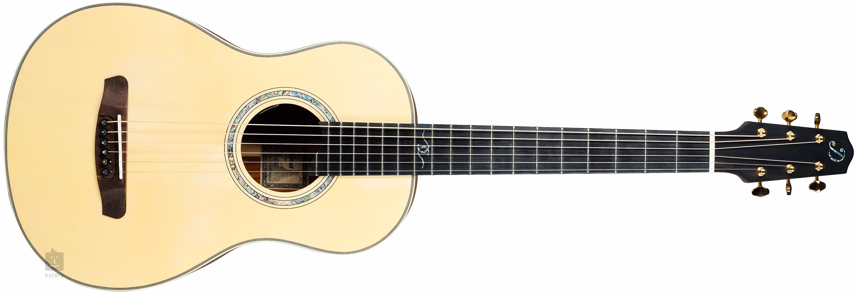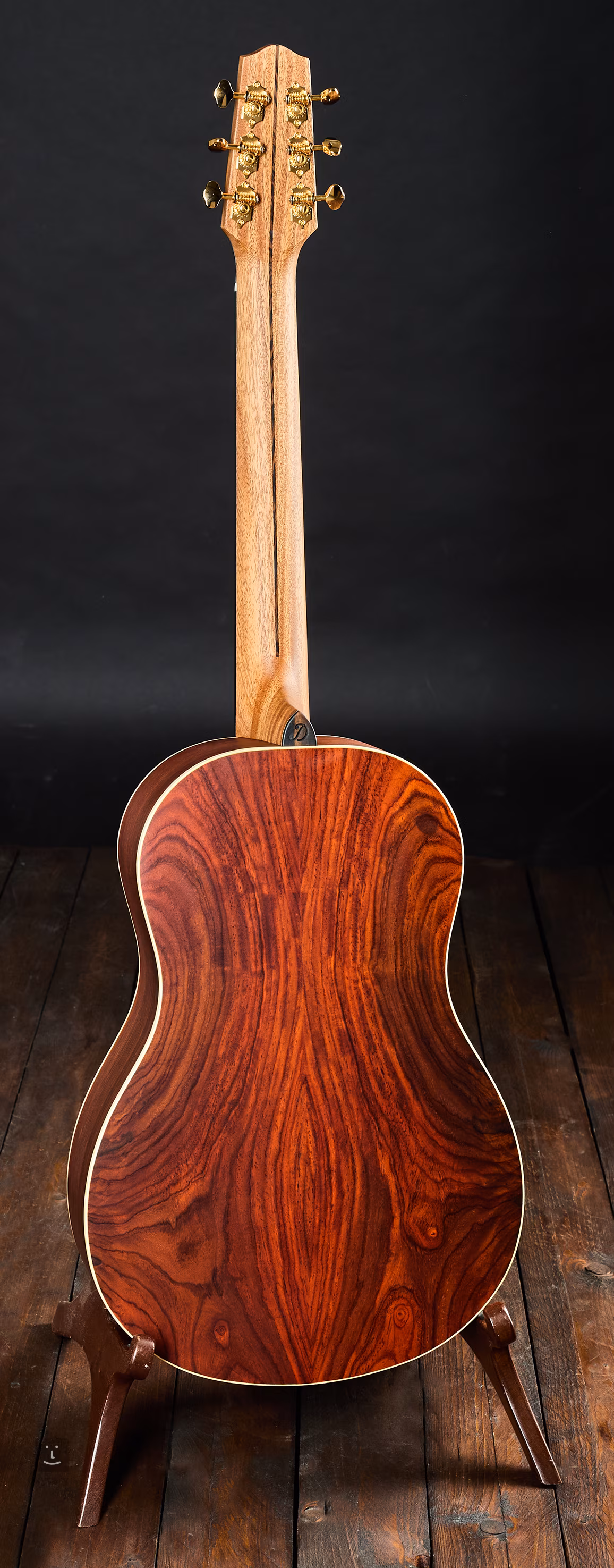 Świerkowa płyta rezonansowa. Tył wykonany z 2 kawałków cocobolo (normalna konstrukcja to 3 kawałki ze względu na rzadkość tego materiału). Miech cocobolo. Instrument jest wyposażony w system nagłośnienia L.R. Baggs Anthem.