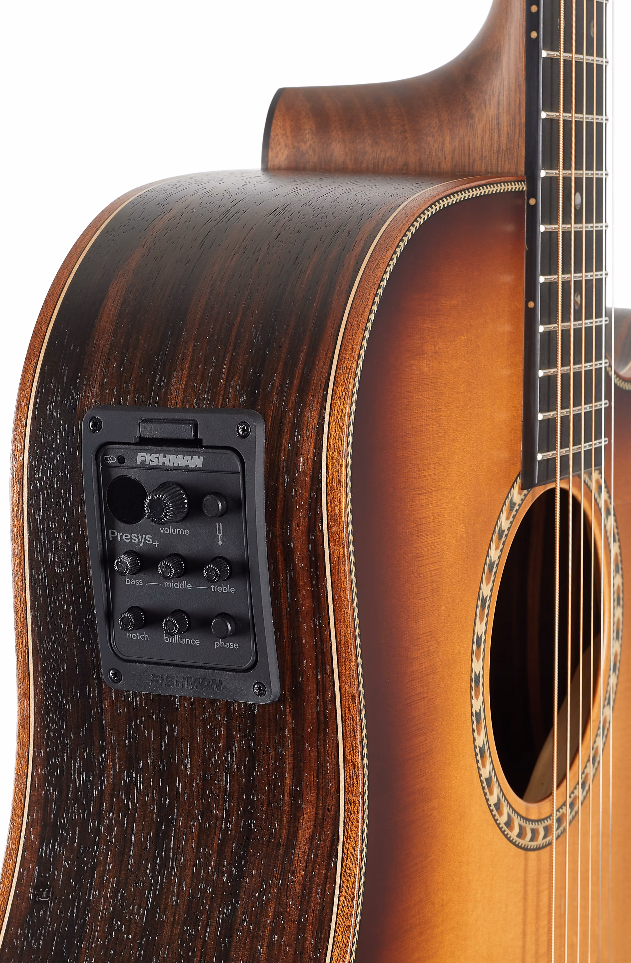 Przedwzmacniacz Fishman Presys+ w korpusie gitary wraz z przetwornikiem podstrunnicowym Fishman Sonicore stanowią idealne rozwiązanie do nagłaśniania gitar akustycznych. Przedwzmacniacz oferuje regulator głośności, wbudowany stroik z wyświetlaczem LED, trzypasmowy korektor uzupełniony o regulator Brilliance oraz regulatory Notch Filter i Phase, dzięki którym można wyeliminować wszystkie zakłócenia, a akustyczny dźwięk instrumentu zabrzmi w pełnej krasie.