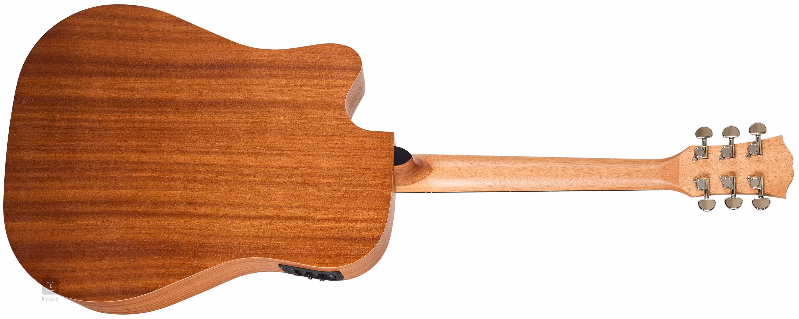 Dowina Puella DCE-S+ to gitara elektroakustyczna z dużym rezonansowym korpusem typu Dreadnought. Przednia płyta instrumentu wykonana jest z litego drewna świerkowego, tylna płyta i boki wykonane są z warstwowego drewna sapele, które jest egzotycznym drewnem pochodzącym z tropikalnych regionów Afryki, o właściwościach podobnych do mahoniu. Do szyjki z tego drewna przyklejono podstrunnicę z ebonizowanego twardego drewna z dwudziestoma progami. Dotyk w wyższych pozycjach podstrunnicy ułatwia dolny wycięcie korpusu. Naturalny dźwięk gitary podkreśla wykończenie powierzchni z otwartymi porami.