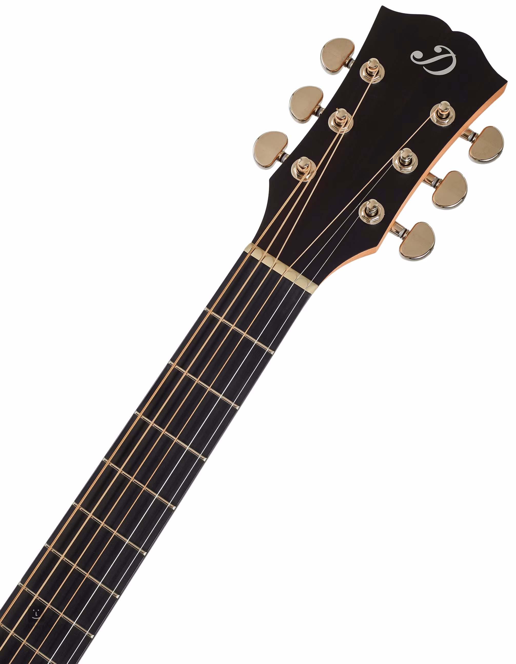 Dowina Puella DCE-S+ to gitara elektroakustyczna z dużym rezonansowym korpusem typu dreadnought. Przód instrumentu wykonano z litego świerku, natomiast tył i boki z laminowanego sapele, egzotycznego drewna z tropikalnej Afryki o właściwościach zbliżonych do mahoniu. Szyjka nato jest przyklejona do ebonizowanej podstrunnicy z twardego drewna z dwudziestoma progami. Niższe wycięcie w korpusie ułatwia dostęp do wyższych pozycji podstrunnicy. Naturalne brzmienie gitary podkreśla wykończenie z otwartymi porami.