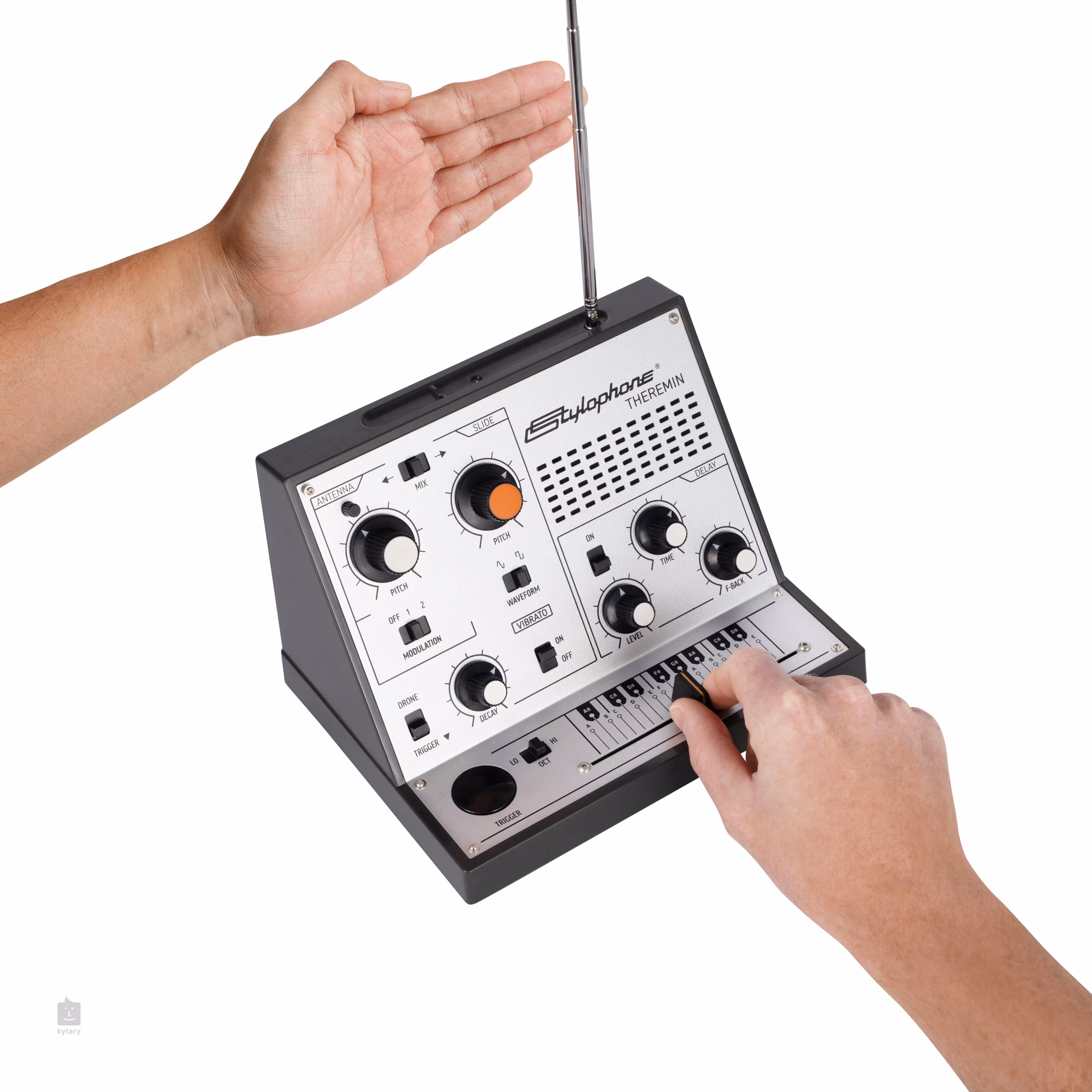 Stylophone Theremin to wrażliwy na dotyk przenośny syntezator, który tworzy eksperymentalne dźwięki, wykrywając ruch użytkownika.