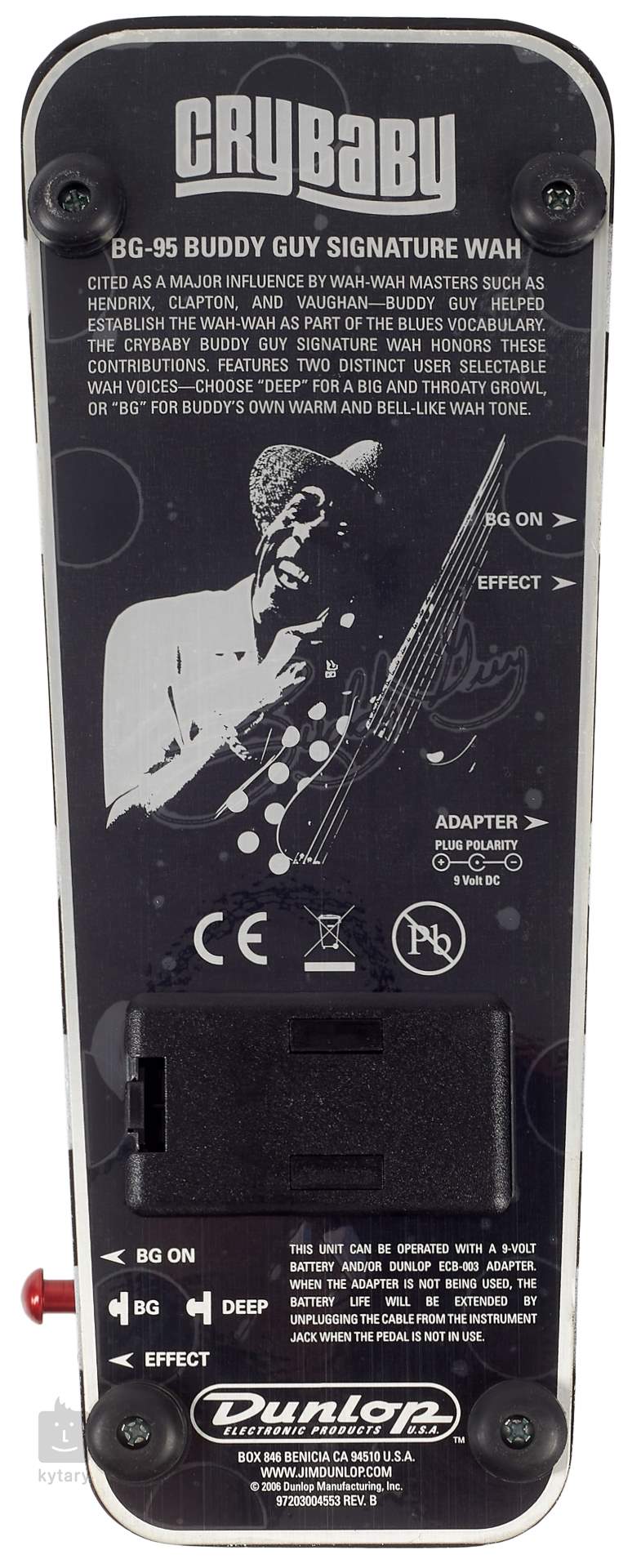 Buddy Guy Signature Cry Baby to charakterystyczny pedał kaczki słynnego amerykańskiego gitarzysty bluesowego, którego wkład sprawił, że "quack" stał się podstawą bluesowego sylabariusza. Na pierwszy rzut oka przyciąga wzrok wzorem w kropki odzwierciedlającym strój koncertowy artysty. Posiada obwód cewki Fasel zapewniający ciepłe, śpiewne brzmienie w wysokich tonach i dwa wybierane tryby efektu kaczki - Deep z dużym, przeszywającym dźwiękiem efektu kaczki i BG z pięknym, ciepłym brzmieniem. Kolorowa dioda LED z boku pedału zawsze niezawodnie informuje o wybranym trybie, a oddzielna dioda LED wskazuje aktywację pedału.