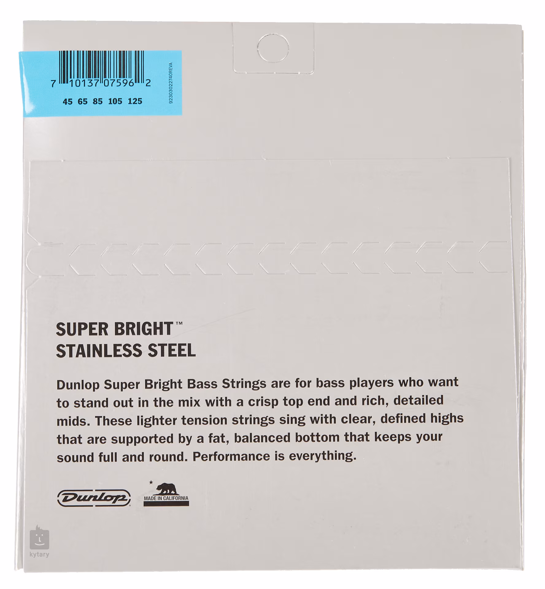 Elektryczne struny basowe DunlopSuper Bright Stainless Steel zostały stworzone dla basistów, którzy chcą się wyróżniać i błyszczeć w każdym miksie. Oferują jasne, wyraźne wysokie tony i bogate, mocne średnie, które stoją na solidnym fundamencie potężnego, zbalansowanego basu. Ich stalowy rdzeń jest nawinięty stalą nierdzewną, aby uzyskać wyraźne, metaliczne brzmienie, idealne do cięższych gatunków, takich jak hard rock czy metal. Stal jest również naturalnie odporna na korozję, zapewniając dłuższą żywotność i trwałość strun.