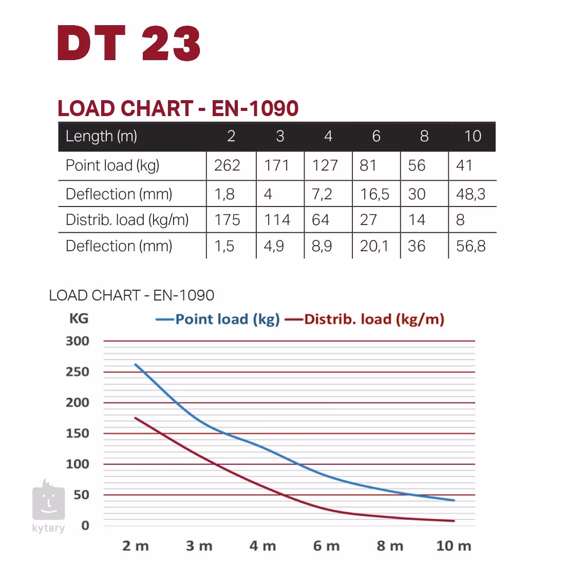 Konstrukcja należy do serii DT23, która oferuje szeroką gamę modeli i akcesoriów. Dostępne są proste konstrukcje nośne o różnych długościach, łączniki w kształcie litery T i różne elementy narożne. Ponadto można dokupić bogate wyposażenie montażowe. Ten system produkcji europejskiej jest w pełni kompatybilny z większością popularnych systemów dostępnych na rynku i posiada certyfikat TÜV, co zapewnia maksymalną niezawodność i bezpieczeństwo dla scen i oświetlenia.