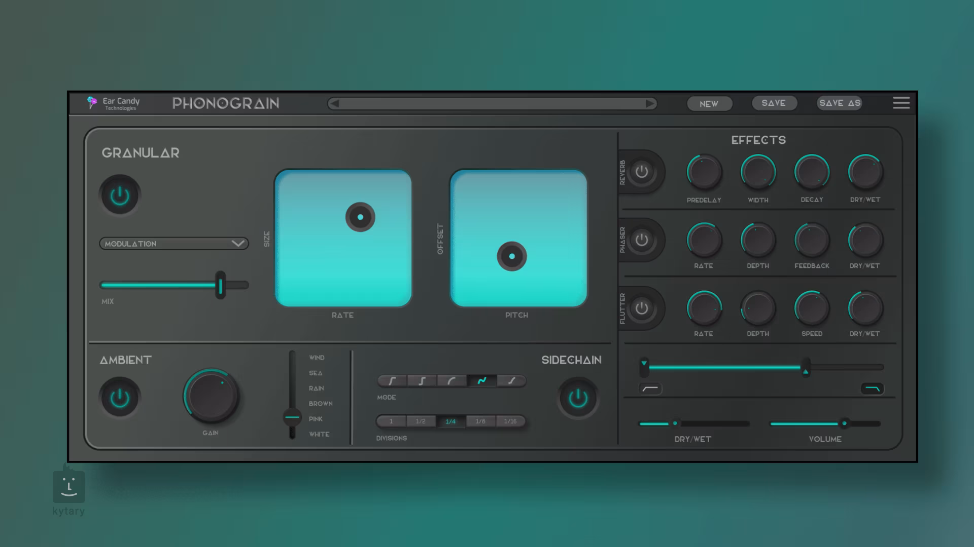 Ear Candy Phonograin koncentruje się na syntezie granularnej i oferuje kilka unikalnych funkcji Ear Candy Technologies do regulacji przetwarzania oraz cztery parametry do dostosowywania odtwarzania.