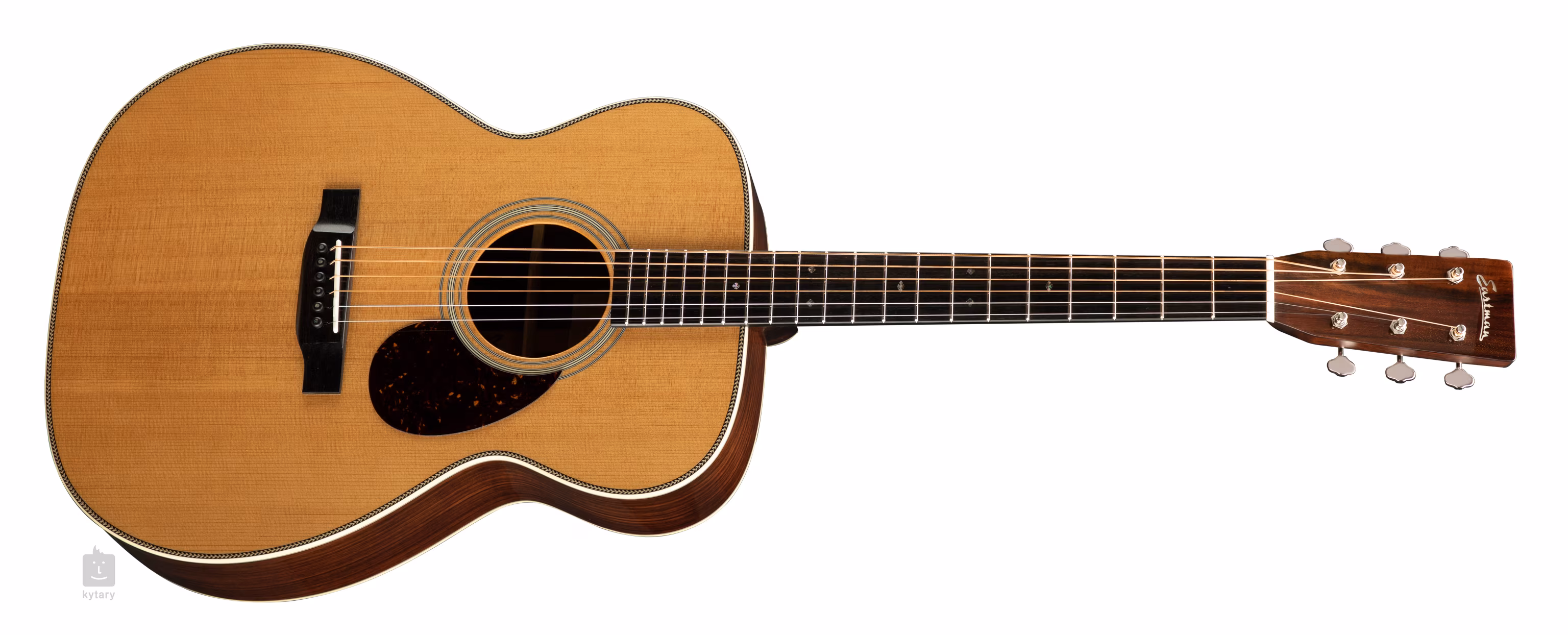 Przód gitary akustycznej Eastman Orchestra E8OM-TC wykonano z termoutwardzalnego świerku Sitka, a tył i boki z palisandru. Hebanowa podstrunnica z 20 progami jest przyklejona do mahoniowej szyjki o przyjemnym profilu "C". Rezonans topu wspiera ręcznie redukowane ożebrowanie (Scalloped X), a orientację na podstrunnicy ułatwiają perłowe znaczniki pozycji w kształcie płatków śniegu (Abalone Snowflakes).