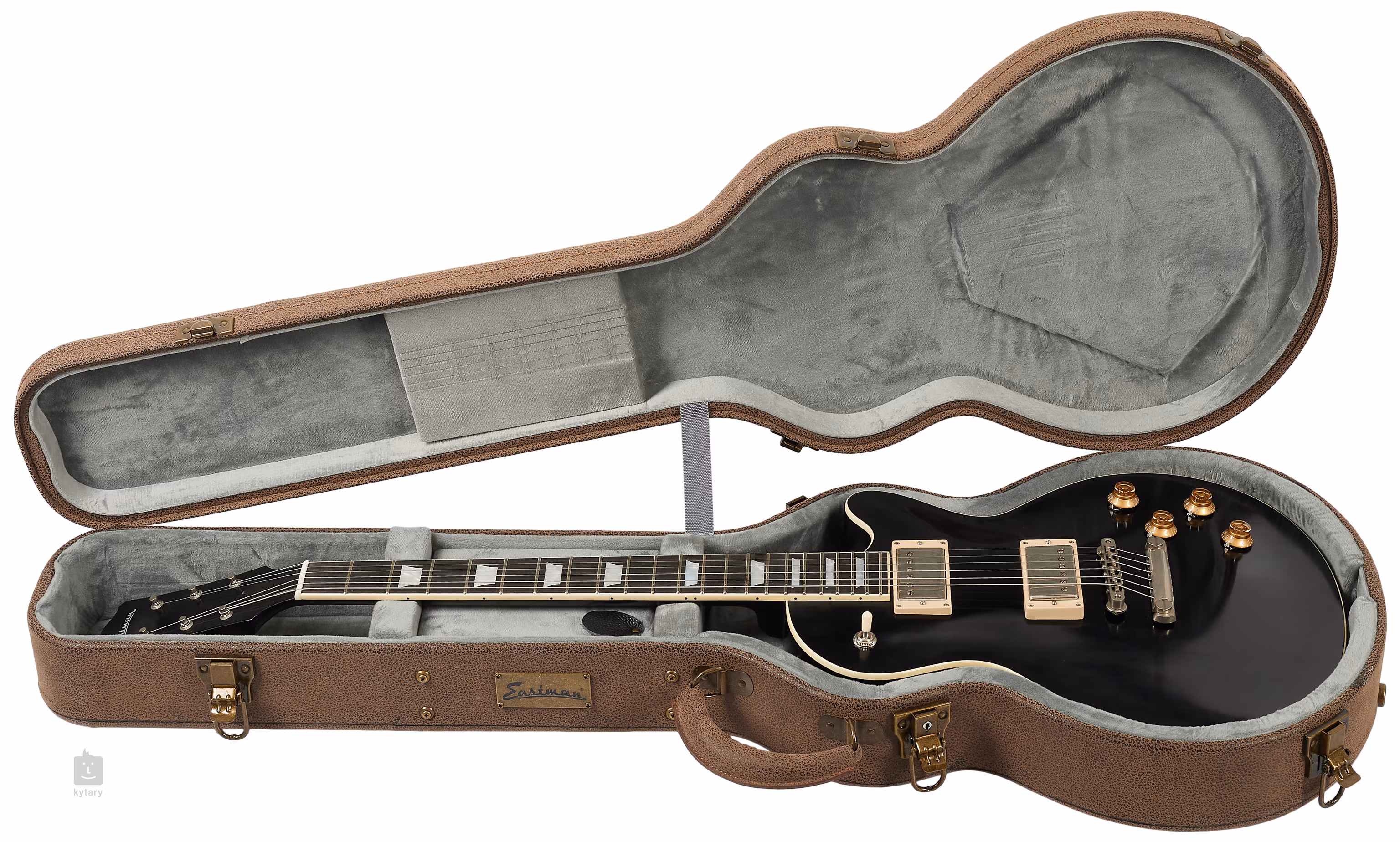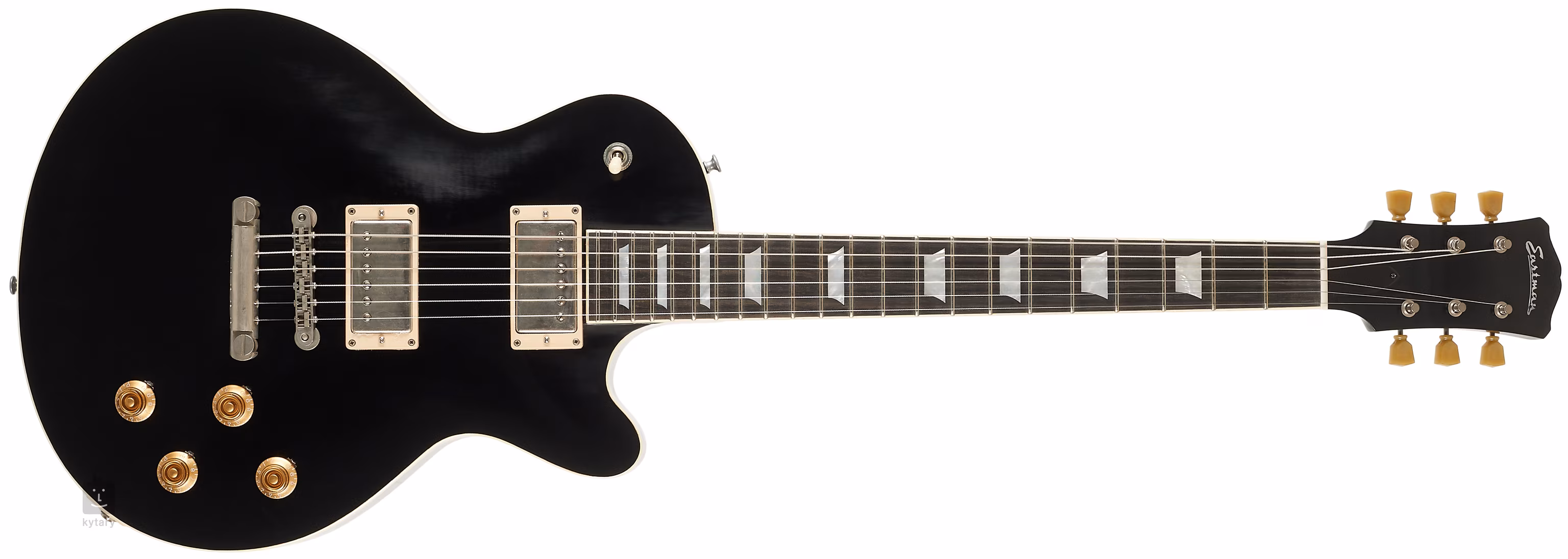 Eastman SB59/TV-BK to gitara elektryczna o konstrukcji typu "LP". Mahoniowy korpus gitary zdobi top z litego klonu płomienistego. Słoje drewna podkreśla błyszczący lakier korpusu z subtelną nutą patyny (Truetone Vintage Gloss) oraz wykończenie Vintage Black. Jednoczęściowa mahoniowa szyjka jest przyklejona do hebanowej podstrunnicy wyposażonej w dwadzieścia dwa progi. Orientację na podstrunnicy ułatwiają perłowe bloki pozycyjne (Pearl Crowns).