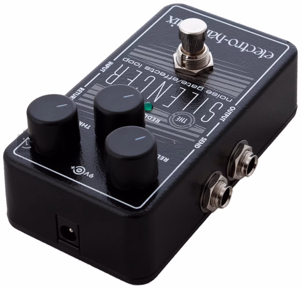 EHX Silencer to efekt Noise Gate, który tłumi niepożądane szumy powstające, gdy efekty pedałowe są podłączone do ścieżki sygnału. Możesz umieścić wybrane hałaśliwe i szumiące efekty (zniekształcenia, przesterowania itp.) w pętli efektów Silencer, co jest szczególnie skutecznym sposobem na wyeliminowanie ich szumów. Możesz wybrać sposób, w jaki pudełko radzi sobie z hałasem, ustawiając trzy elementy sterujące, gdzie Thresh określa próg głośności, przy którym aktywowana jest bramka, Release szybkość, z jaką efekt reaguje na spadek głośności poniżej ustawionego progu (4 ms - 8 s) i Reduction ilość zredukowanego sygnału (-70/+4 dB, tj. pudełko może zarówno towarzyszyć, jak i wzmacniać szum w razie potrzeby).