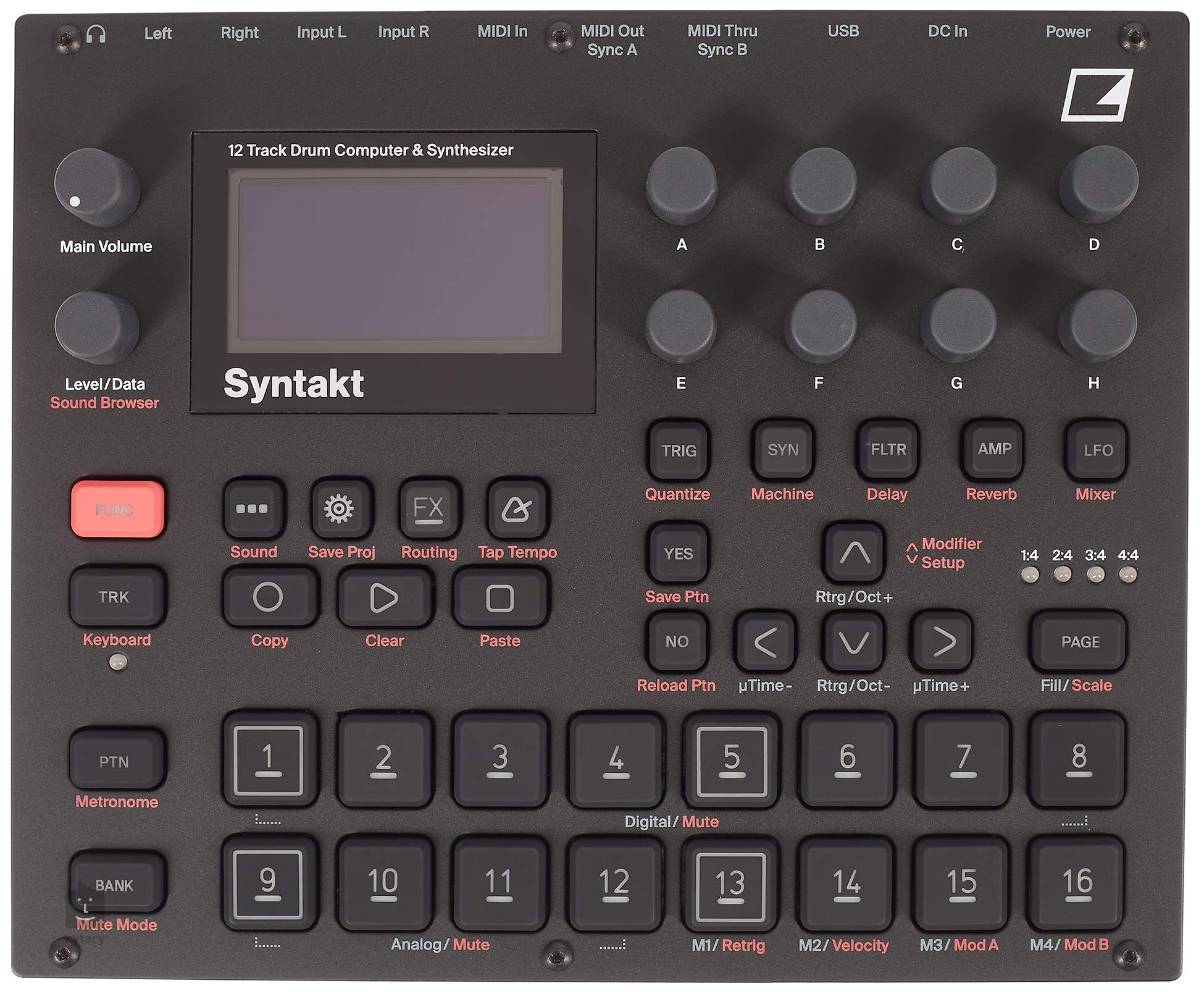 Dzięki graficznemu wyświetlaczowi i przejrzystemu, podświetlanemu na kolorowo panelowi sterowania można uzyskać najlepszy przegląd swojej produkcji. Oczywiście w zestawie znajduje się również obsługa MIDI i wyjście słuchawkowe. Dostępne są efekty studyjnej jakości, takie jak Delay, Reverb, Distorion, filtry i przypisywalne LFO dla każdej ścieżki audio. Syntakt oferuje również tryb klawiatury, aby przenieść produkcję na wyższy poziom i oczywiście ulubiony na świecie 64-krokowy sekwencer dla większej dynamiki podczas występów na żywo i sesji studyjnych.