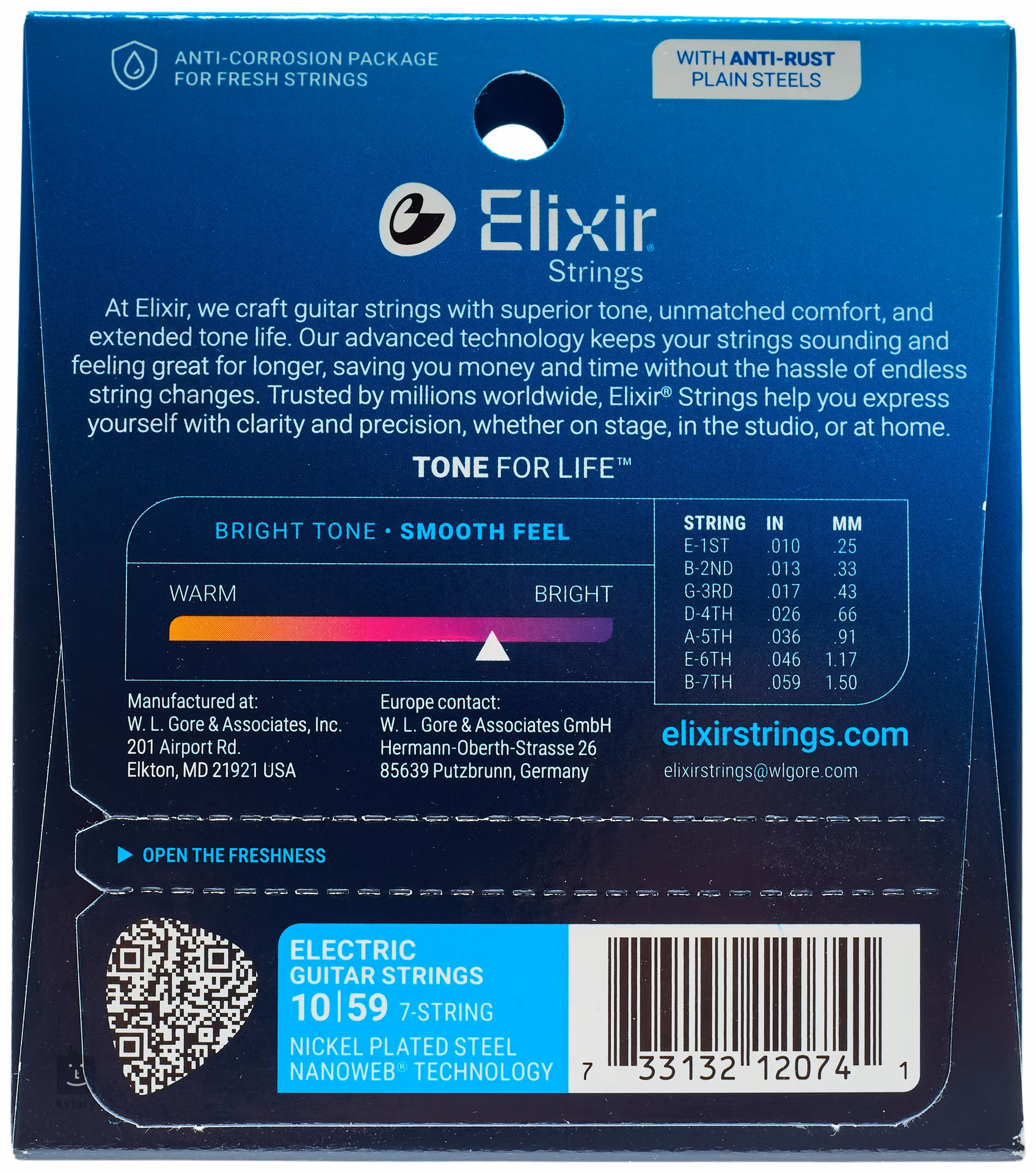 Struny Elixir są znane ze swojej wyjątkowo długiej żywotności, z którą trudno konkurować. Dzięki specjalnej powłoce są odporne na korozję, wilgoć, zabrudzenia i pot, dzięki czemu długo zachowują jasny i przenikliwy ton. Pod względem brzmienia są to bardzo mocne struny ze stali niklowanej, które mają mocny charakter i brzmienie. Ten zestaw jest pokryty warstwą ochronną Nanoweb, dzięki czemu struny są wyjątkowo wytrzymałe i gładsze niż zwykłe struny. Warstwa Nanoweb jest dodatkowo cieńsza niż wersja Polyweb, dzięki czemu praktycznie nie tłumi naturalnego zachowania i brzmienia strun. Twoja gitara zachowa więc jasne i przenikliwe brzmienie.
