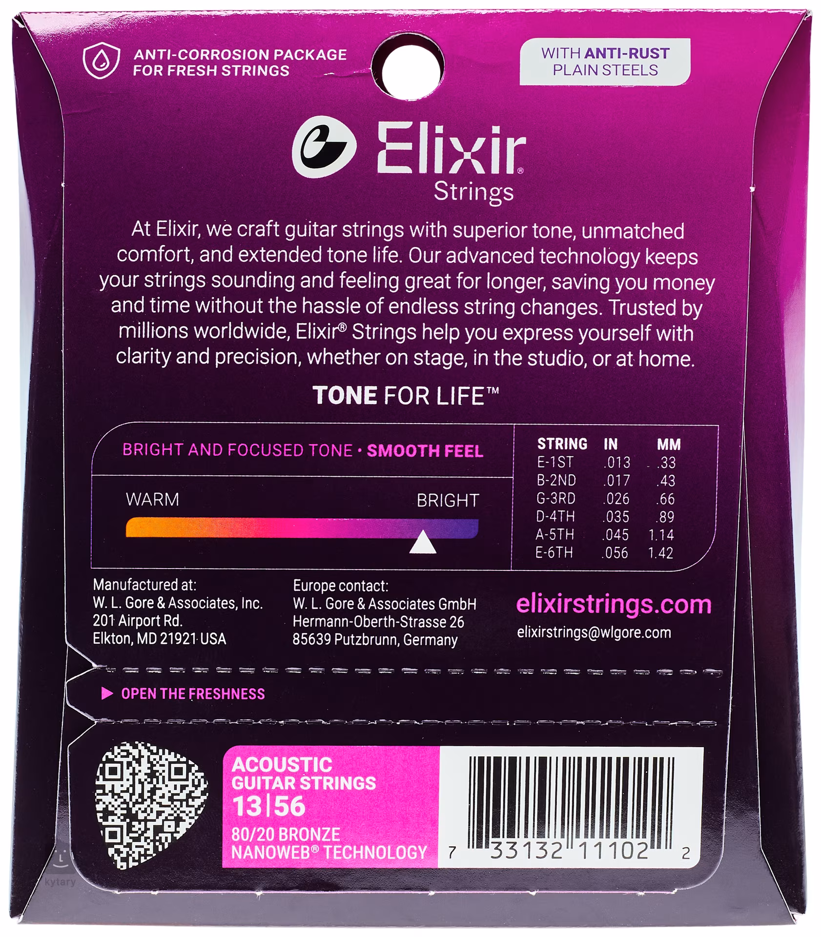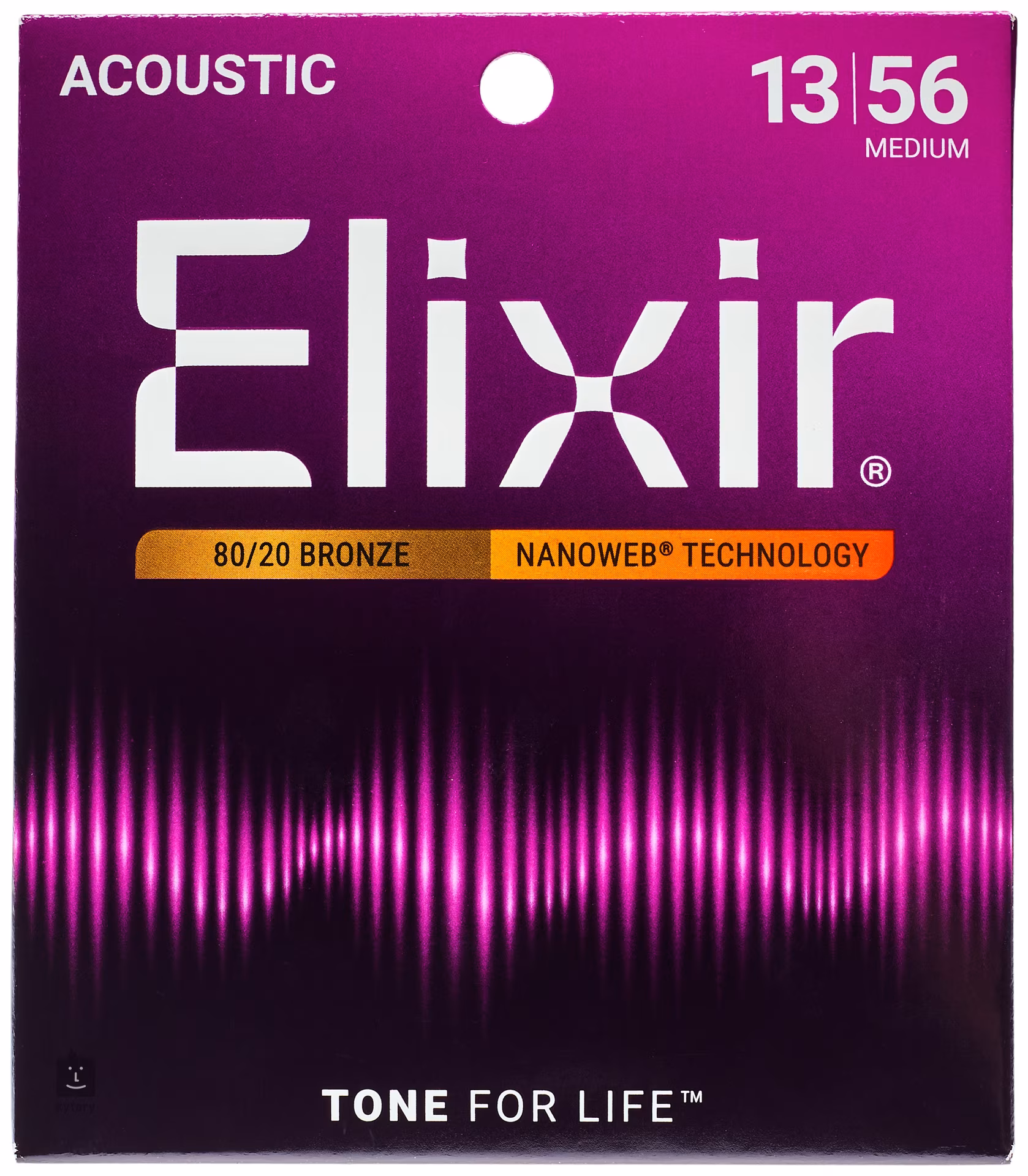 Struny Elixir słyną z wyjątkowo długiej żywotności, z którą bardzo trudno konkurować. Dzięki specjalnej powłoce są odporne na korozję, wilgoć, zanieczyszczenia i pot, dzięki czemu długo zachowują jasne i przebijające brzmienie. Pod względem brzmienia są to bardzo mocne, dzwoniące i rezonujące struny, które przebiją się na każdej scenie lub nagraniu. Struny oznaczone jako 80/20 Bronze mają owijkę wykonaną ze stopu brązu (80/20), co nadaje im bardzo przenikliwy charakter i dzwonki – w rezultacie otrzymujemy brzmienie, w którym dominują wysokie częstotliwości.