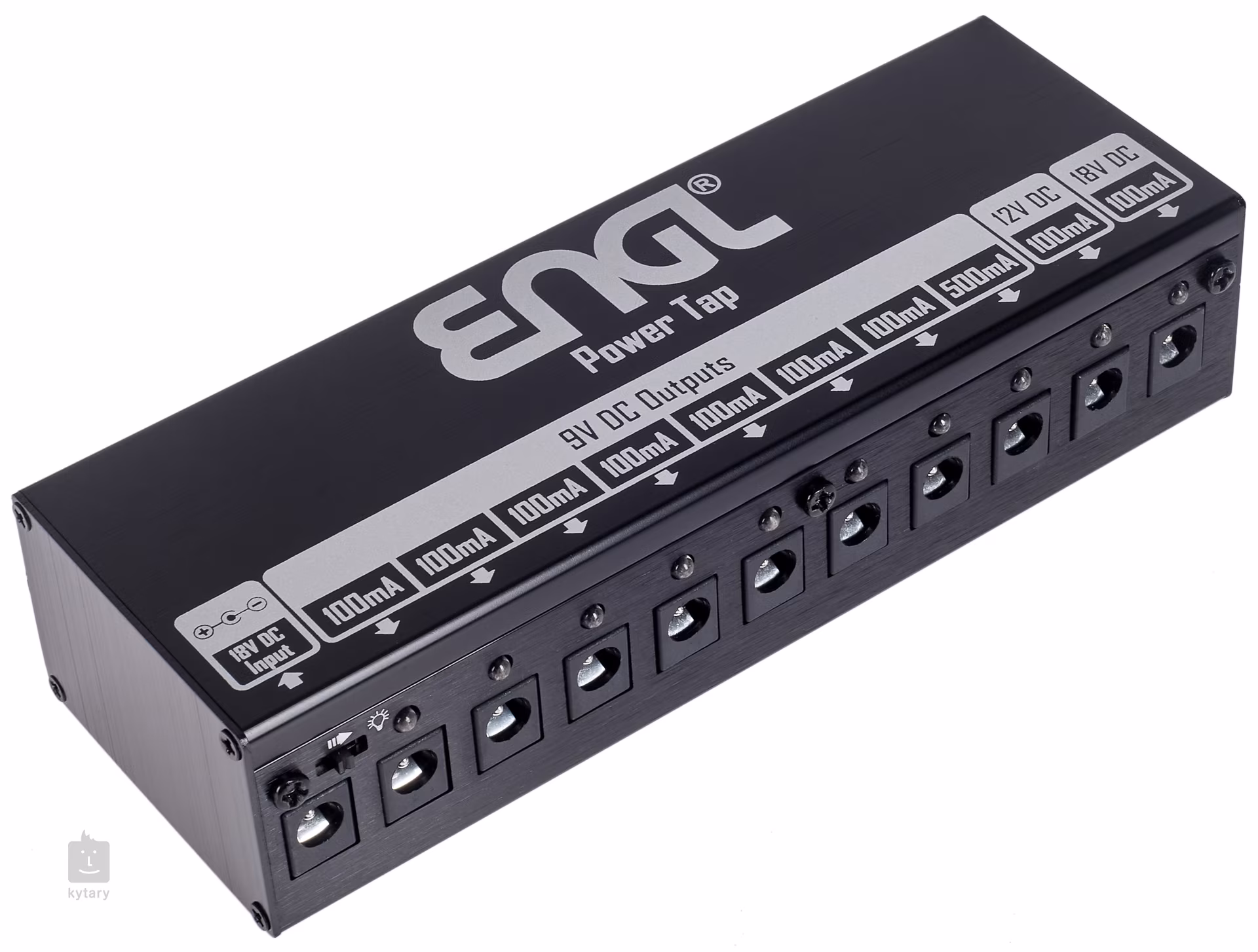 Multi-adapter Engl Power Tap w prosty i skuteczny sposób rozwiązuje problem zasilania pedalboardu. Oferuje w sumie dziesięć izolowanych wyjść, z których osiem to standardowe 9V (7x 100 mA, 1x 500 mA), jedno zapewniające 12V (100 mA) i jedno 18V (100 mA). W zestawie znajduje się również zestaw kabli połączeniowych, zasilacz i kabel odwracający polaryzację.