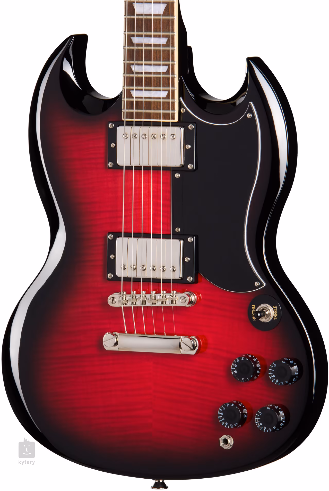 Korpus gitary elektrycznej SG Tribute Plus Cherry Burst z mahoniu zdobi efektowna okleina z klonu płomienistego (flamed maple). Słoje klonu podkreśla błyszczący lakier i kolorowe wykończenie Cherry Burst. Do mahoniowej szyjki przyklejona jest podstrunnica z drzewa figowego, wyposażona w dwadzieścia dwa progi o rozmiarze Medium Jumbo. Orientację na podstrunnicy ułatwiają blokowe znaczniki z imitacji masy perłowej. Dwa firmowe humbuckery z magnesami ceramicznymi zapewniają gitarze pełne, soczyste brzmienie, które docenisz w rocku i innych gatunkach muzycznych. Kontury brzmienia można regulować za pomocą standardowych regulatorów. Struny są zamocowane w firmowych mechanizmach die-cast oraz poprzez mostek LockTone TOM w strunociągu. Stylowe wykończenie podkreśla obramowanie podstrunnicy, trójwarstwowa płytka ochronna Black SG Special oraz logo firmy na główce gitary.