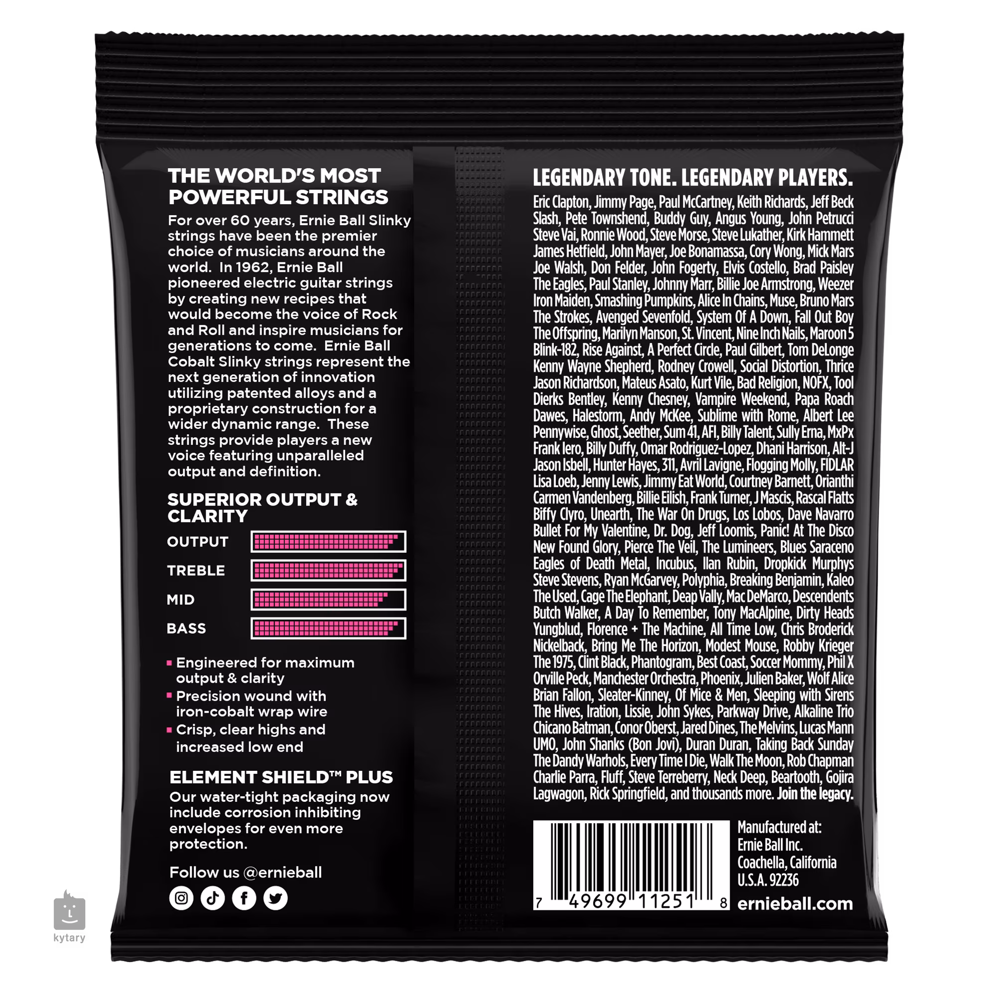 Struny do gitar elektrycznych marki Ernie Ball z serii Cobalt Slinky zostały opracowane tak, aby zmaksymalizować głośność i czystość dźwięku, dlatego wykorzystują najnowocześniejsze materiały i technologie produkcji. Charakteryzują się dużym zakresem dynamiki, dużą ilością wyższych tonów harmonicznych, mocniejszymi basami i czystymi, przebijającymi się tonami wysokimi. Ich magia polega na wykorzystaniu kobaltu, który lepiej współpracuje z polem magnetycznym przetworników, zapewniając precyzyjne wychwytywanie dźwięku. Dzięki kobaltowi struny są również bardziej miękkie i elastyczne, co docenisz zwłaszcza podczas bendingu. Opakowanie zawiera trzy zestawy strun.