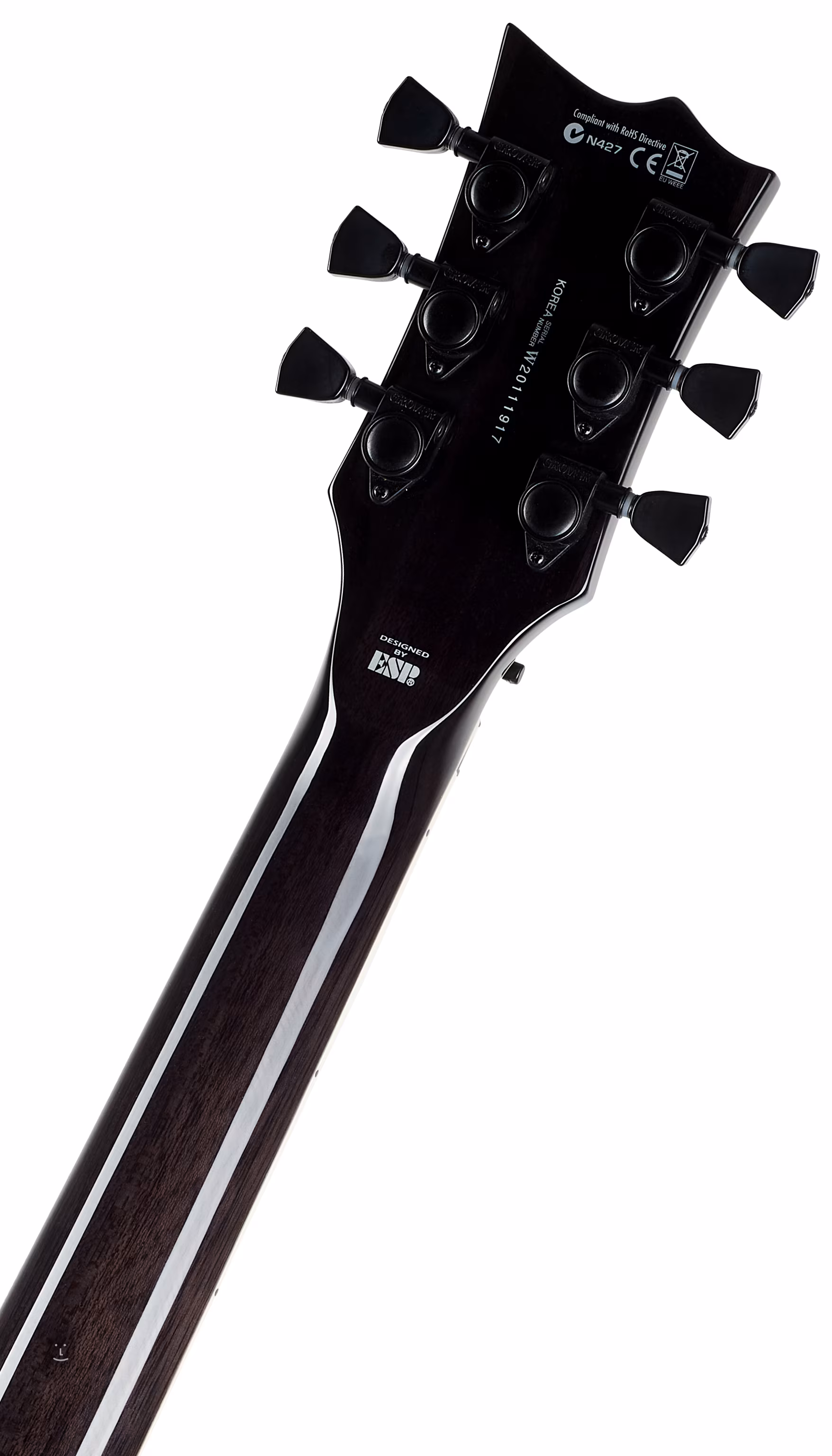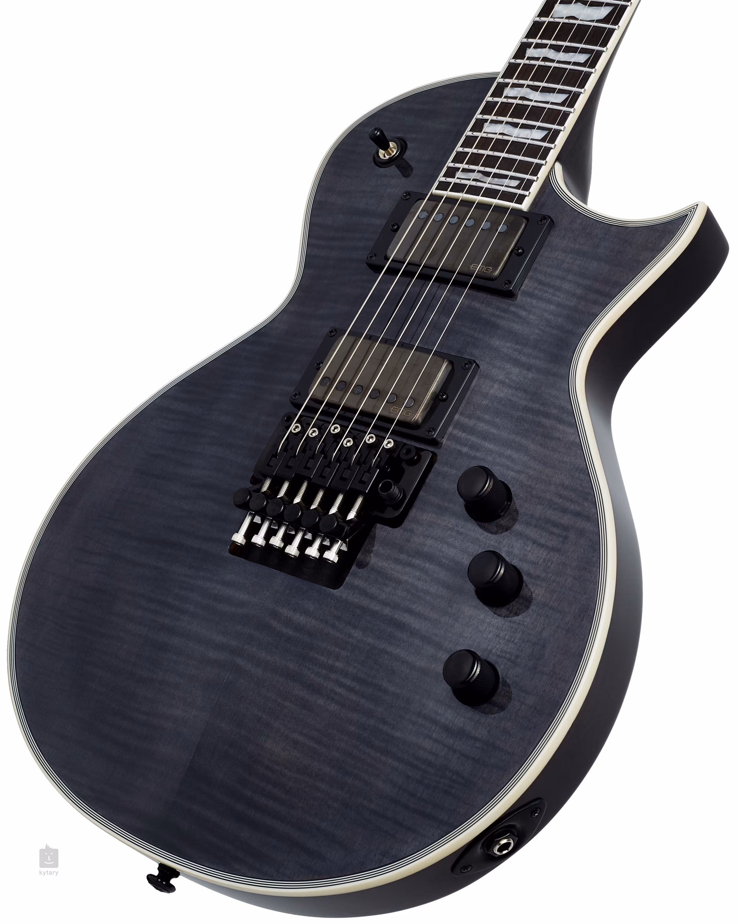 Mahoniowy korpus modelu EC-1000FR SEE THRU BLACK ozdobiony jest efektownym fornirem z klonu płomienistego o wyrazistym usłojeniu drewna wspartym wykończeniem See Thru Black. Trzyczęściowa mahoniowa szyjka o konstrukcji set-thru, tj. szyjka wpuszczona głębiej w korpus, połączona jest z hebanową podstrunnicą Macassar, wyposażoną w dwadzieścia cztery progi ze stali nierdzewnej typu Extra Jumbo.